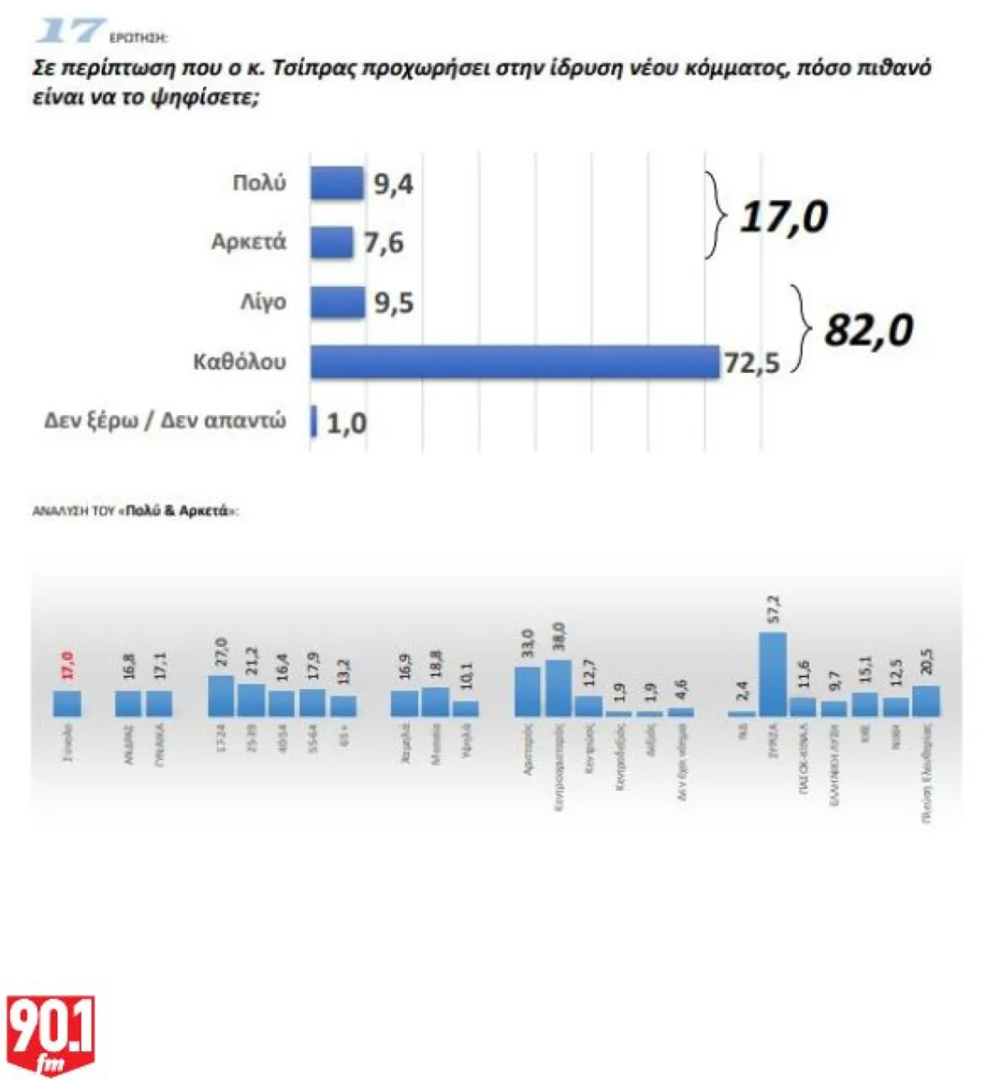 Η αδυναμία των κομμάτων της Κεντροαριστεράς να καταστούν πραγματικοί διεκδικητές της εξουσίας συντηρεί τη συζήτηση για μια πιθανή επαναφορά του πρώην πρωθυπουργού και προέδρου του ΣΥΡΙΖΑ κ. Α. Τσίπρα με έναν νέο πολιτικό φορέα, τον οποίο ως πολύ και αρκετά πιθανό να τον ψηφίσει δηλώνει το 17% του συνόλου, το οποίο συγκροτείται από το 57,2% των ψηφοφόρων του ΣΥΡΙΖΑ, το 20,5% της Πλεύσης Ελευθερίας και το 15,1% του ΚΚΕ. Ο κ. Τσίπρας καταγράφει σημαντική διείσδυση στα νεότερα ηλικιακά κοινά, στους αριστερούς και κεντροαριστερούς ψηφοφόρους.