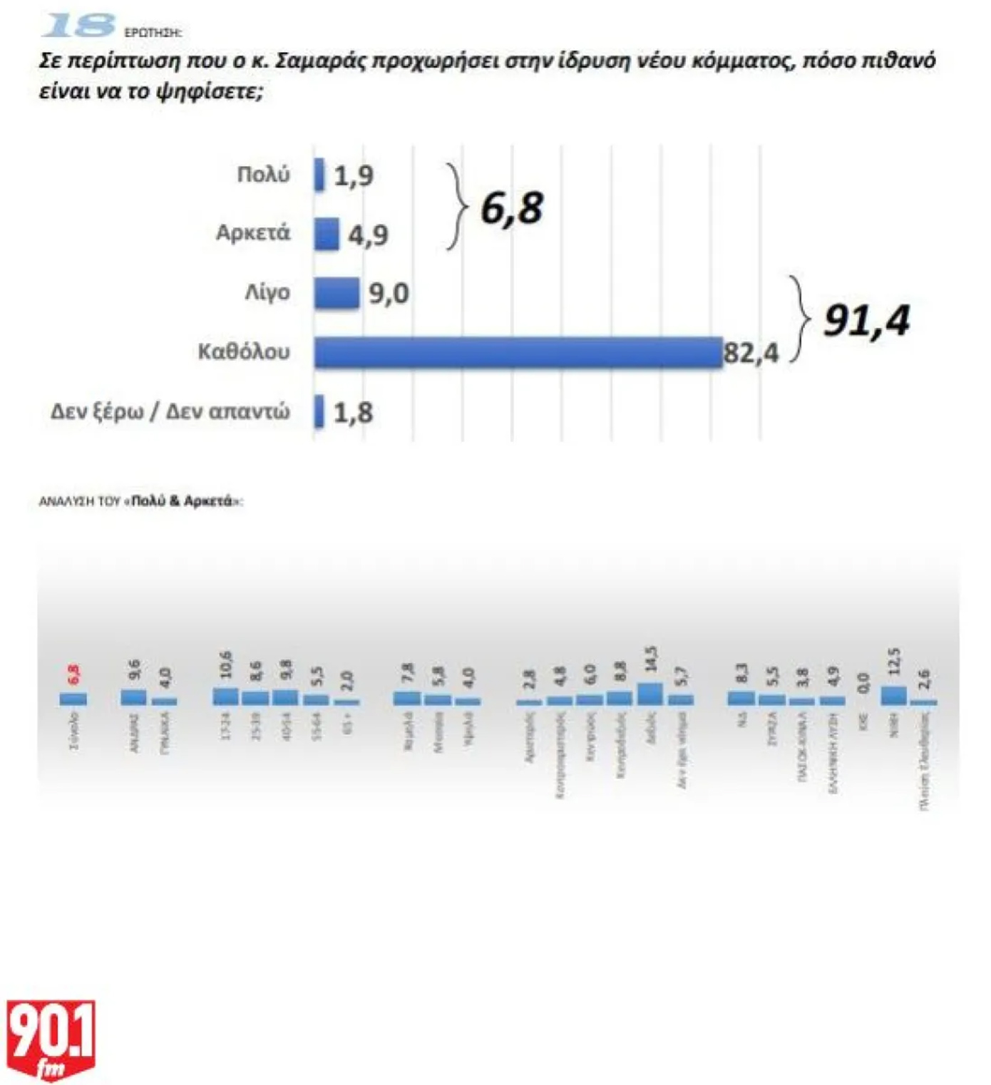 Μικρότερη αποδοχή καταγράφει το ενδεχόμενο ίδρυσης καινούργιου κόμματος ενός άλλου πρώην πρωθυπουργού του κ. Σαμαρά, με την πιθανότητα ψήφου να ανιχνεύεται στο 6,8% του συνόλου, προερχόμενο κυρίως από τη ΝΔ (8,3%), τη Νίκη (12,5%) και τη Φωνή Λογικής (31,3%). Ο κ. Σαμαράς συνεχίζει να διατηρεί μια επιρροή στο ανδρικό κοινό και στους δεξιούς ψηφοφόρους, ενώ ενδιαφέρον παρουσιάζει το εύρημα σύμφωνα με το οποίο οι νεότερες ηλικιακές ομάδες είναι πιο διατεθειμένες να στηρίξουν ένα τέτοιο εγχείρημα σε σχέση με τις μεγαλύτερες που παραμένουν σταθερά προσηλωμένες στην κυβερνητική πλειοψηφία.