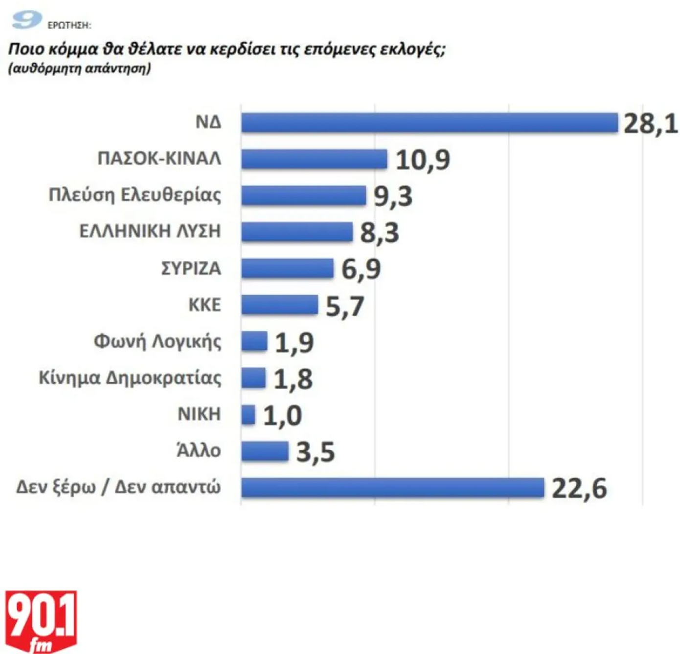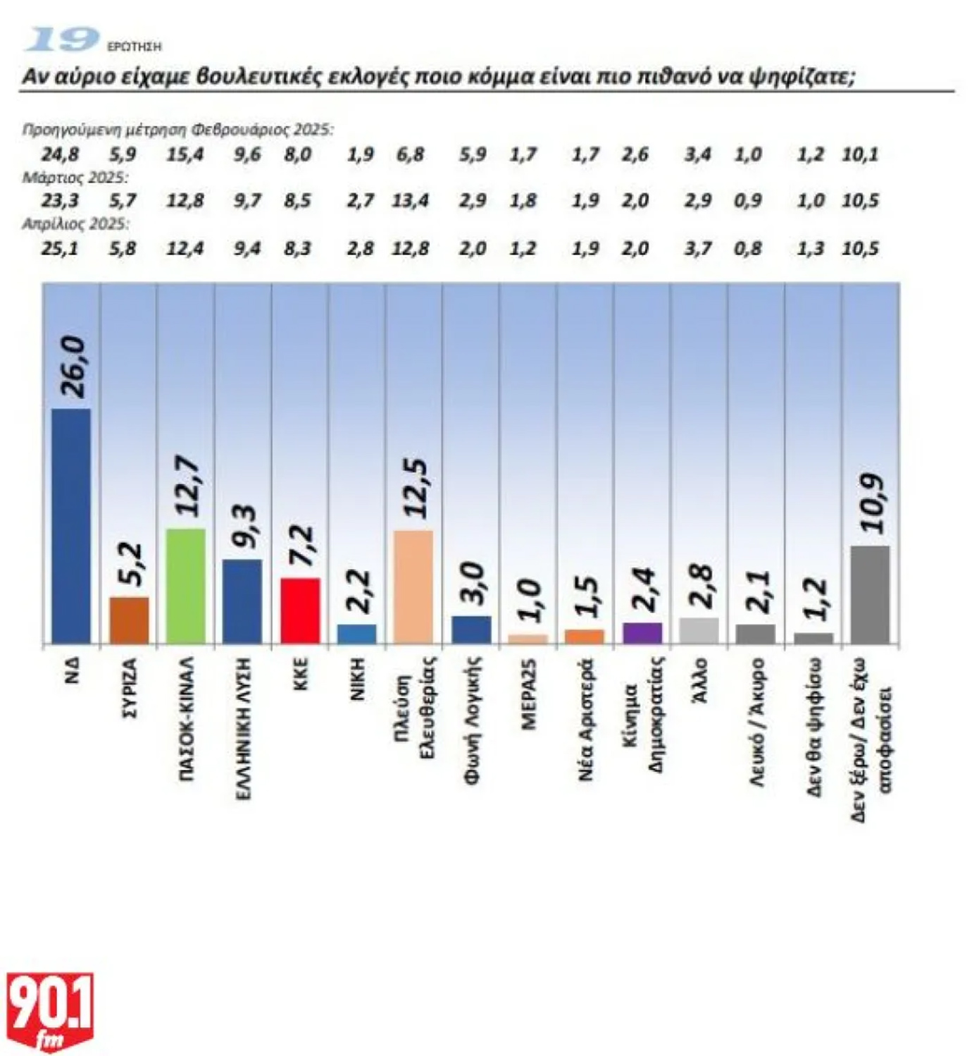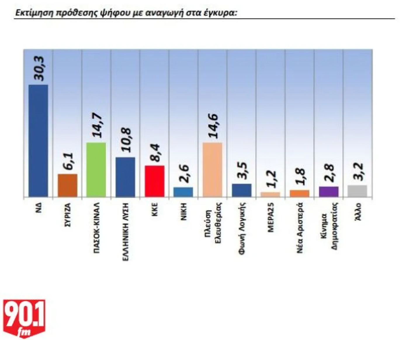 Τα παραπάνω συνοψίζονται στον πίνακα της πρόθεσης ψήφου, όπου η ΝΔ συνεχίζει να εμφανίζει μία μικρή ανοδική τάση, που τη φέρνει στο 26%, ενώ ύστερα από μεγάλο διάστημα το ΠΑΣΟΚ περνά ξανά στη δεύτερη θέση με 12,7% και οριακή διαφορά από την Πλεύση Ελευθερίας, που με το 12,5% πιστοποιεί την ανθεκτικότητά της και συγκρατεί τις δυνάμεις της. Σταθερή τάση για τον κ. Βελόπουλο και την Ελληνική Λύση, που με το 9,3% αποτυπώνεται ως ένας συμπαγής πολιτικός φορέας με παγιωμένο εκλογικό ακροατήριο, στο 7,2% το ΚΚΕ, ενώ συνεχίζεται η δημοσκοπική φθορά του ΣΥΡΙΖΑ που καταγράφεται πλέον στο 5,2%, χωρίς ορατά σημάδια ανάκαμψης στο άμεσο μέλλον.