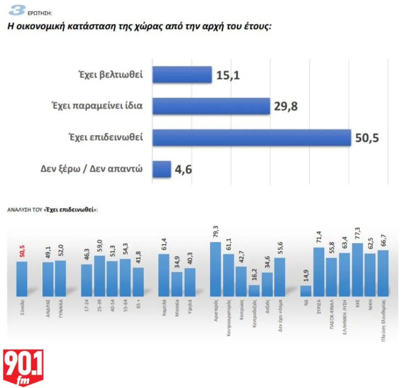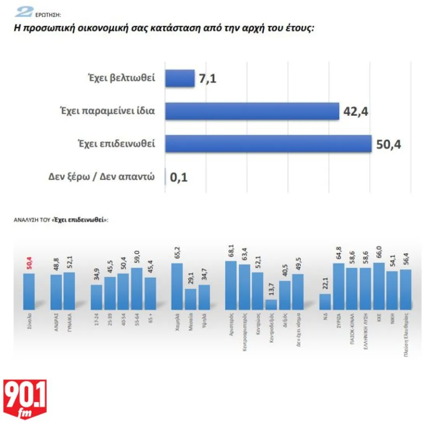 Επιδείνωση της προσωπικής οικονομικής του κατάστασης είδε το 50,4% του πληθυσμού, ενώ στασιμότητα σε σχέση με το περασμένο εξάμηνο βλέπει το 42,4%. Αντίστοιχα τα ποσοστά και για τη συνολική οικονομική κατάσταση της χώρας με τον δείκτη όμως της βελτίωσης να βρίσκεται στο 15,1% σε διπλάσιο ποσοστό από την προσωπική οικονομική κατάσταση. Και σε αυτές τις ερωτήσεις οι απαντήσεις έχουν σαφέστατο ιδεολογικό και κομματικό πρόσημο.