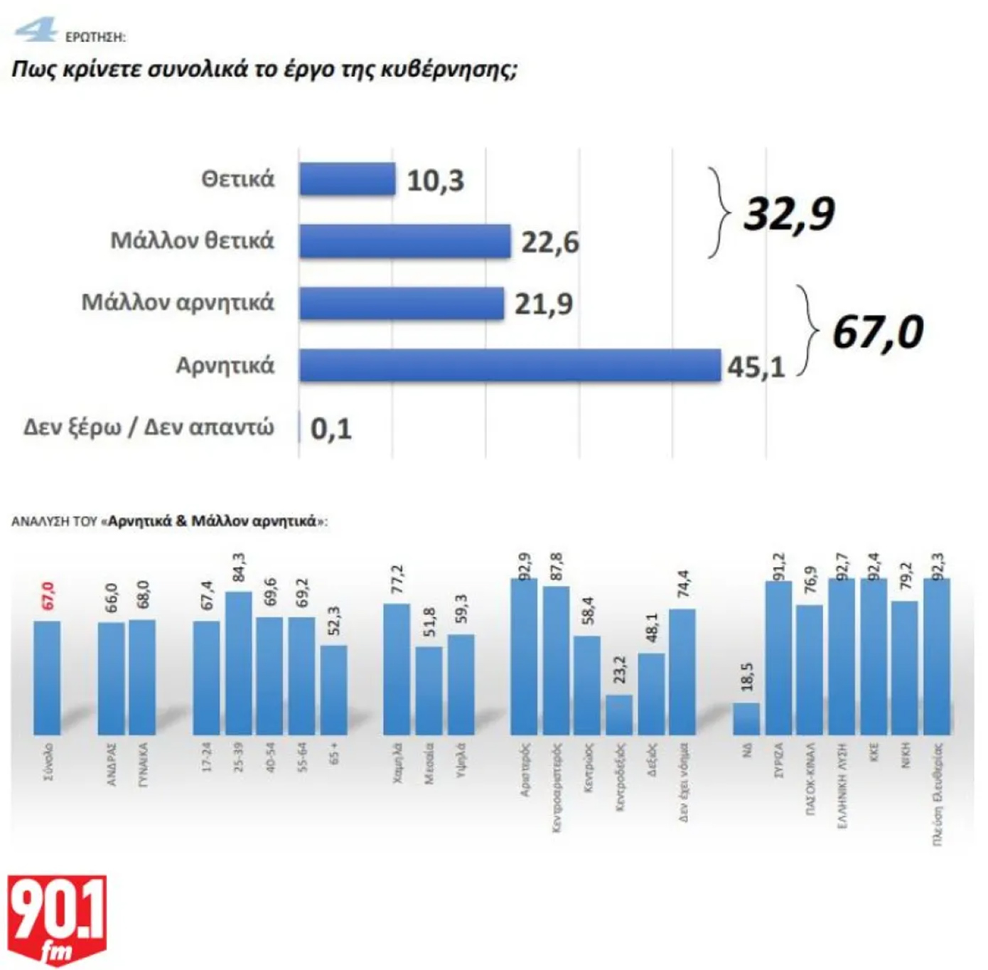 Ειδικότερα, το 32,9% κρίνει θετικά το συνολικό έργο της κυβέρνησης έναντι 67%, με τους τομείς του κυβερνητικού έργου που σημειώνουν τις μεγαλύτερες επιδόσεις να είναι ο ψηφιακός μετασχηματισμός του κράτους με 57,4%, η εθνική άμυνα με 48,3%, η προσέλκυση ξένων επενδύσεων με 38,5% και η εξωτερική πολιτική με 36,3%. Στον αντίποδα, χαμηλή βαθμολογία για την κυβέρνηση από τους πολίτες για το ζήτημα της ακρίβειας με 14,2%, της αντιμετώπισης της εγκληματικότητας με 17,6%, στο φορολογικό με 23%, στο μεταναστευτικό με 23,4% και στα θέματα της λειτουργίας της δικαιοσύνης με 23,8%.