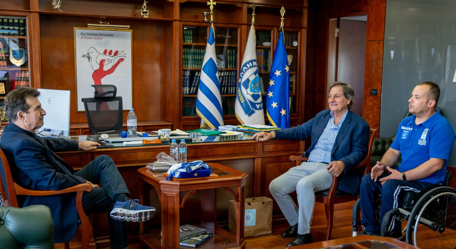 Ο κ. Καλούδης, εκπροσωπώντας το Διοικητικό Συμβούλιο της ΟΣΕΚΑ, μαζί με τον καλαθοσφαιριστή του ΑΣ ΑΤΛΑΣ και της Εθνικής Ομάδας μπάσκετ με Αμαξίδιο, Αρμάντ Μίνα, επισκέφθηκαν τον κ. Χρυσοχοΐδη, προκειμένου να τον ανακηρύξουν σε «Πρεσβευτή Καλής Θέλησης για την καλαθοσφαίριση με αμαξίδιο», τη μέγιστη τιμή της Ομοσπονδίας σε άτομα με σπουδαία προσφορά.