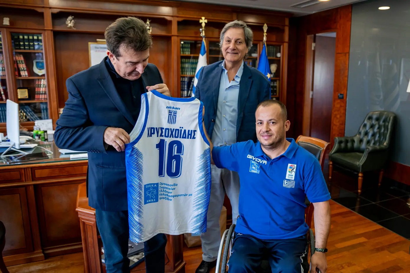 Ο πρόεδρος της ΟΣΕΚΑ, Χρήστος Καλούδης και ο καλαθοσφαιριστής του ΑΣ ΑΤΛΑΣ, Αρμάντ Μίνα, παρέδωσαν στον Μιχάλη Χρυσοχοΐδη την τιμητική πλακέτα με την αναγόρευσή του σε «Πρεσβευτή Καλής Θέλησης για την καλαθοσφαίριση με αμαξίδιο», όπως και μια μπλούζα της Εθνικής ομάδας μπάσκετ με Αμαξίδιο με το όνομά του.
