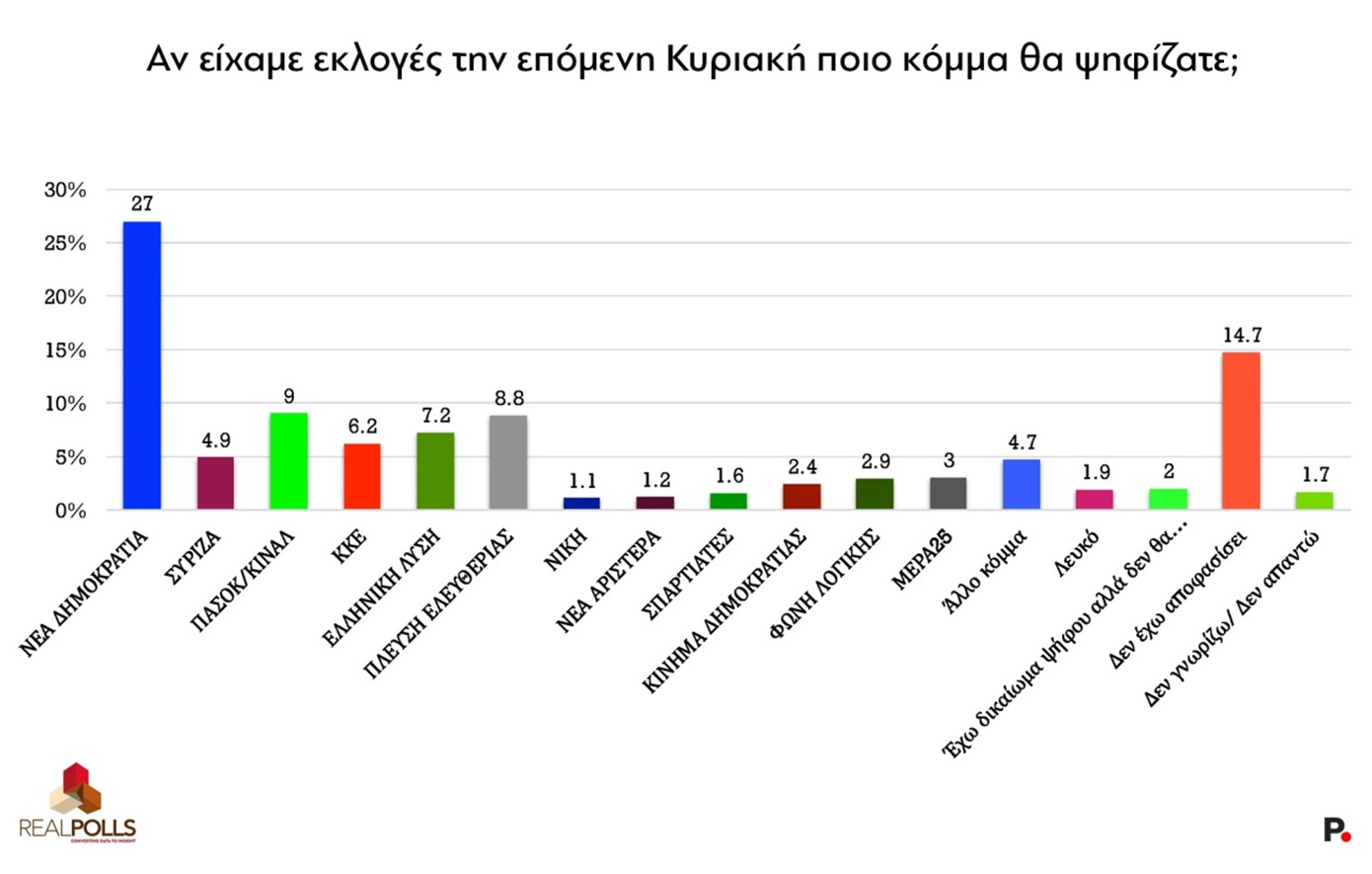 Σταθεροποιητικά στοιχεία για τη Νέα Δημοκρατία αποτυπώνει η νέα δημοσκόπηση της Real Polls η οποία τη φέρνει ξεκάθαρα πάνω από το 30%, ενώ η Πλεύση Ελευθερίας καταγράφει σημαντική κάμψη, παραχωρώντας τη δεύτερη θέση στο ΠΑΣΟΚ. Ωστόσο, το ΠΑΣΟΚ δεν φαίνεται να αποκομίζει ουσιαστικά πολιτικά οφέλη από αυτή την εξέλιξη.