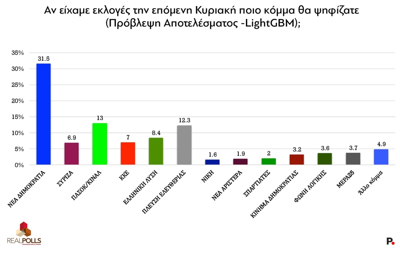 Στην εκτίμηση εκλογικού αποτελέσματος, η ΝΔ σταθεροποιείται στο 31,5%, το ΠΑΣΟΚ στο 13% και η Πλεύση Ελευθερίας στο 12,3%, με μεγάλη πτώση από το 18,9% του Μαΐου.
