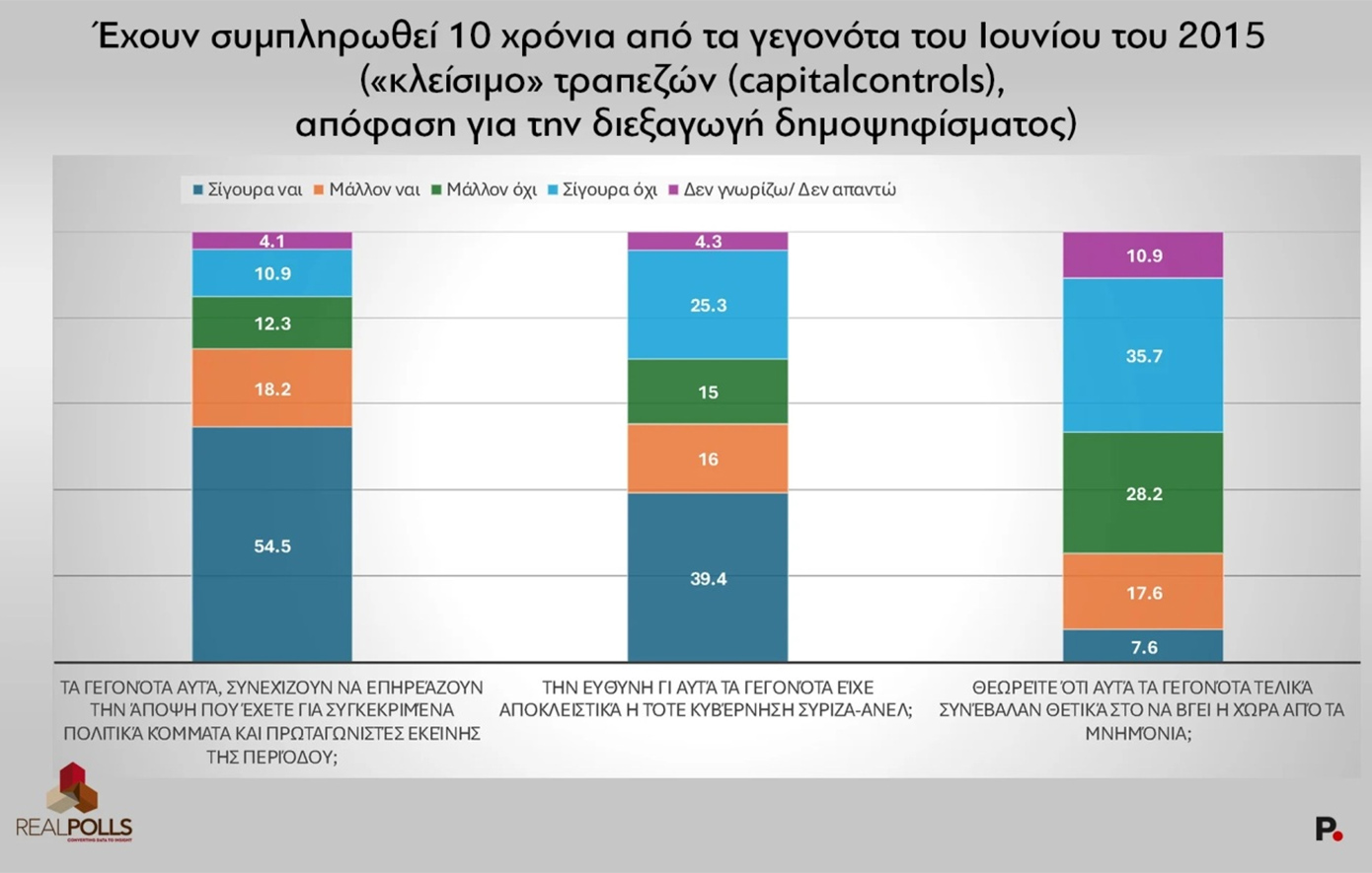 Ιδιαίτερη βαρύτητα αποκτούν και οι απόψεις για την περίοδο του 2015, την πρωθυπουργία Τσίπρα, το δημοψήφισμα και τα capital controls. Το 73% των ερωτηθέντων δηλώνει πως τα γεγονότα εκείνης της χρονιάς εξακολουθούν να επηρεάζουν τη γνώμη του για τους πολιτικούς της περιόδου.
