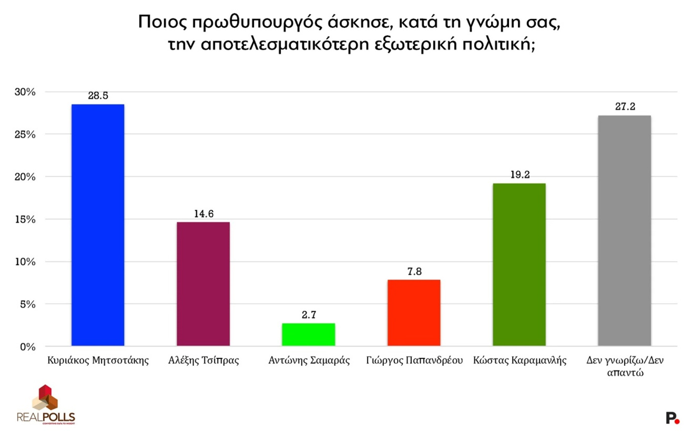 Στον τομέα της εξωτερικής πολιτικής, από τις απαντήσεις στην ερώτηση «Ποιος Πρωθυπουργός άσκησε, κατά τη γνώμη σας, την αποτελεσματικότερη εξωτερική πολιτική;», πρώτος κατατάσσεται ο Κυριάκος Μητσοτάκης με 28,5%, δεύτερος ο Κώστας Καραμανλής με 19,2% και τρίτος ο Αλέξης Τσίπρας με 14,6%.