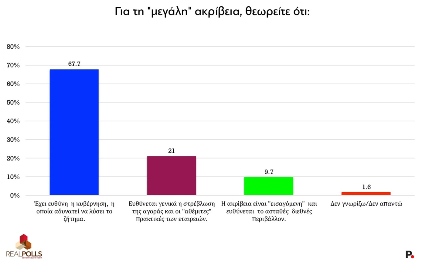 Τέλος, σύμφωνα με τη δημοσκόπηση, η ακρίβεια παραμένει η βασική ανησυχία των πολιτών, ακολουθούμενη από τα προβλήματα στο Εθνικό Σύστημα Υγείας και τους χαμηλούς μισθούς. Το 67% θεωρεί ότι για την υψηλή ακρίβεια ευθύνεται η κυβέρνηση, ενώ μόλις το 9,7% αποδίδει το φαινόμενο σε εξωτερικούς παράγοντες και «εισαγόμενη ακρίβεια».