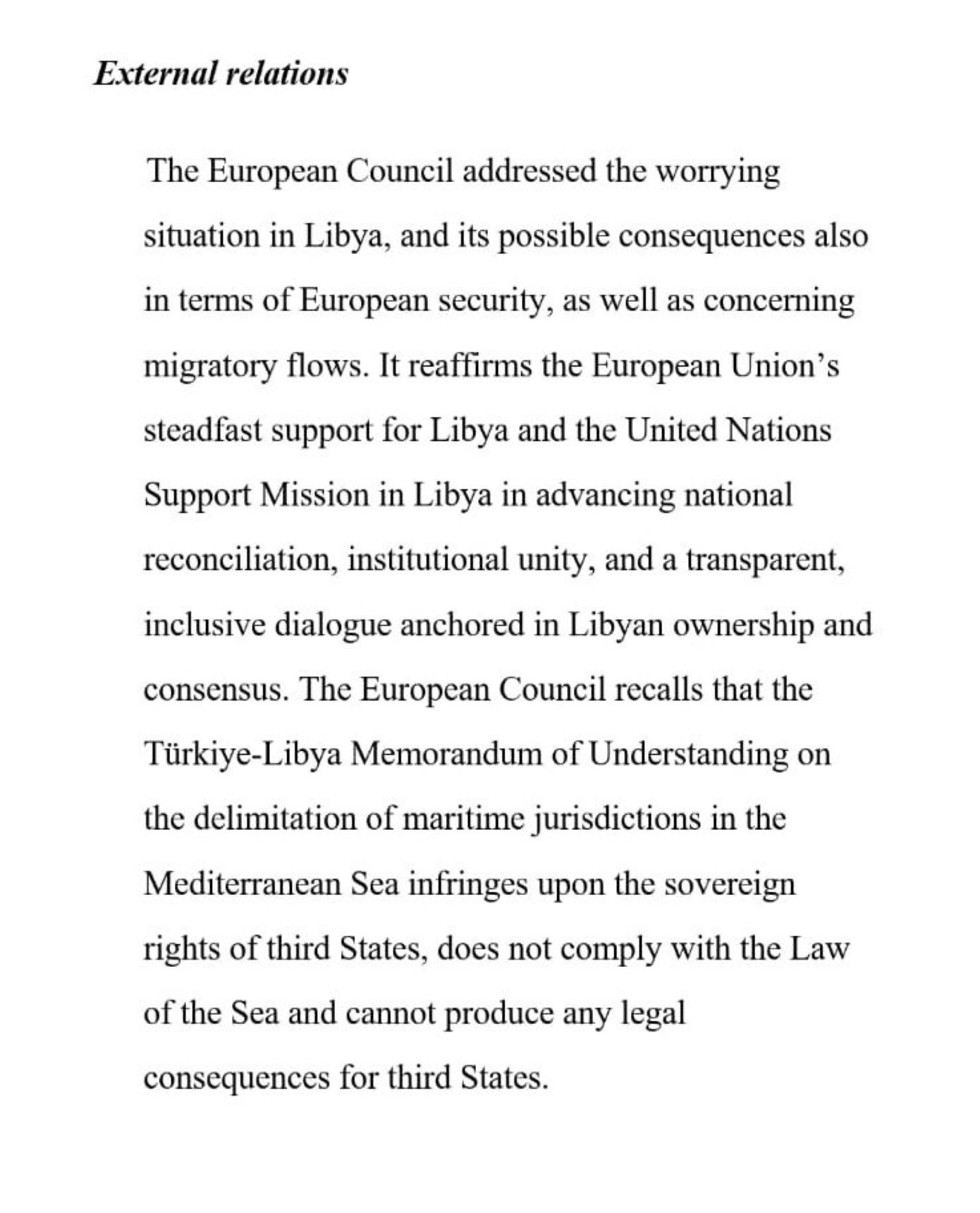 «Το Ευρωπαϊκό Συμβούλιο υπενθυμίζει ότι το Μνημόνιο Συνεννόησης Τουρκίας-Λιβύης για την οριοθέτηση περιοχών θαλάσσιας Δικαιοδοσίας στη Μεσόγειο παραβιάζει τα κυριαρχικά δικαιώματα τρίτων κρατών, δεν συνάδει με το Δίκαιο της Θάλασσας και δεν μπορεί να παράγει έννομες συνέπειες για τρίτα κράτη».