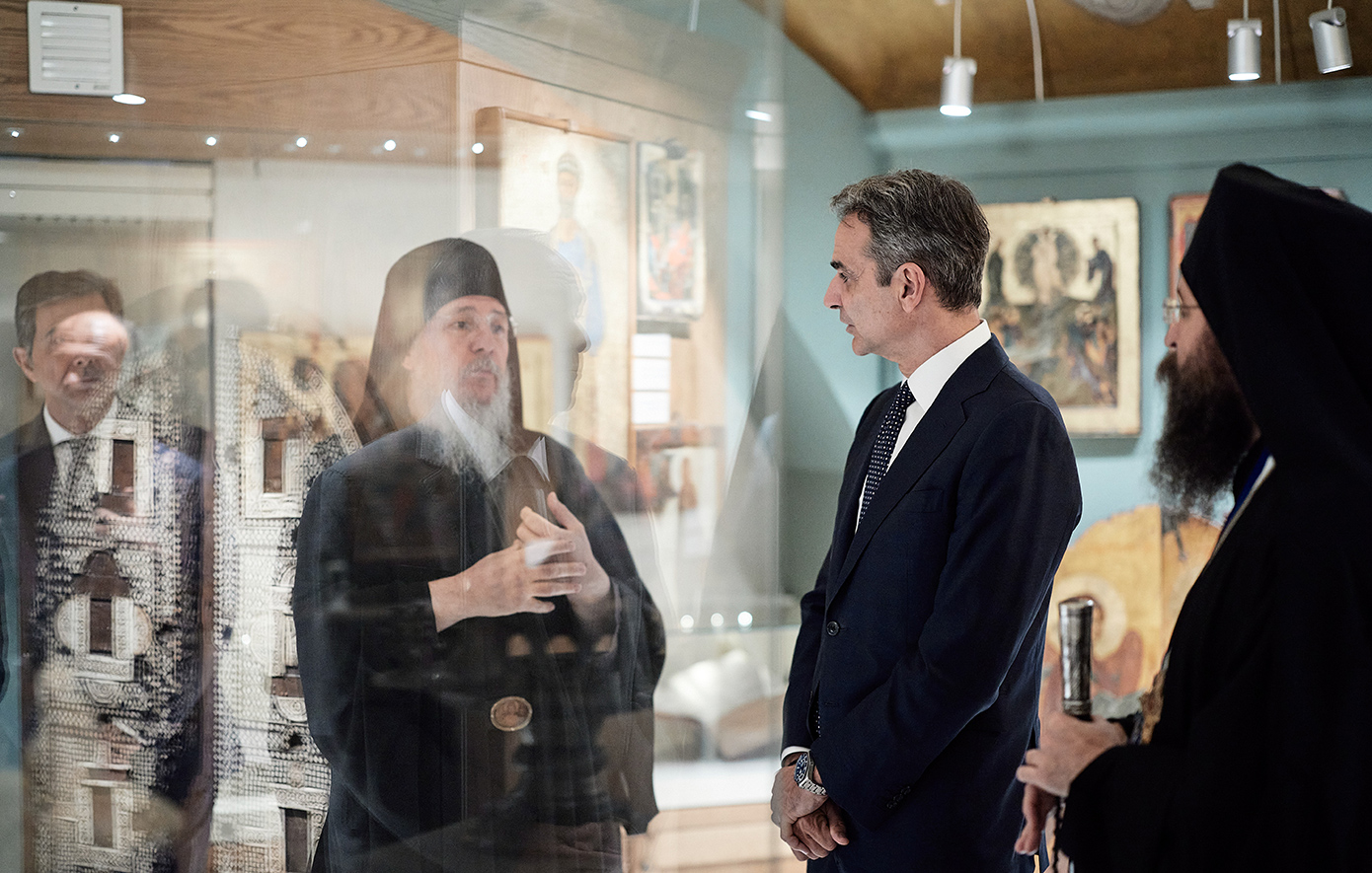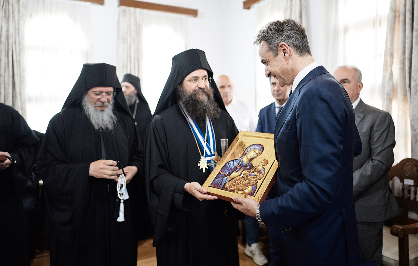 «Σε αυτό το ασταθές διεθνές περιβάλλον, το μήνυμα αυτού του τόπου πρέπει να είναι ένα μήνυμα αλήθειας, προσήλωσης στην παράδοση αλλά και ανοιχτής σκέψης, απαντώντας με νηφαλιότητα σε ακραίες επίκαιρες προκλήσεις. Και αφήνοντας την οργανωμένη πολιτεία να συντονίζει τα του οίκου της και επιβεβαιώνοντας πως η θρησκεία έχει μία μεγάλη δύναμη, δύναμη να ενώνει πέρα από τις κοσμικές δοξασίες, ώστε να μπορεί να ανυψώνει πνευματικά τους πολίτες» είπε ο κ. Μητσοτάκης και συνέχισε: