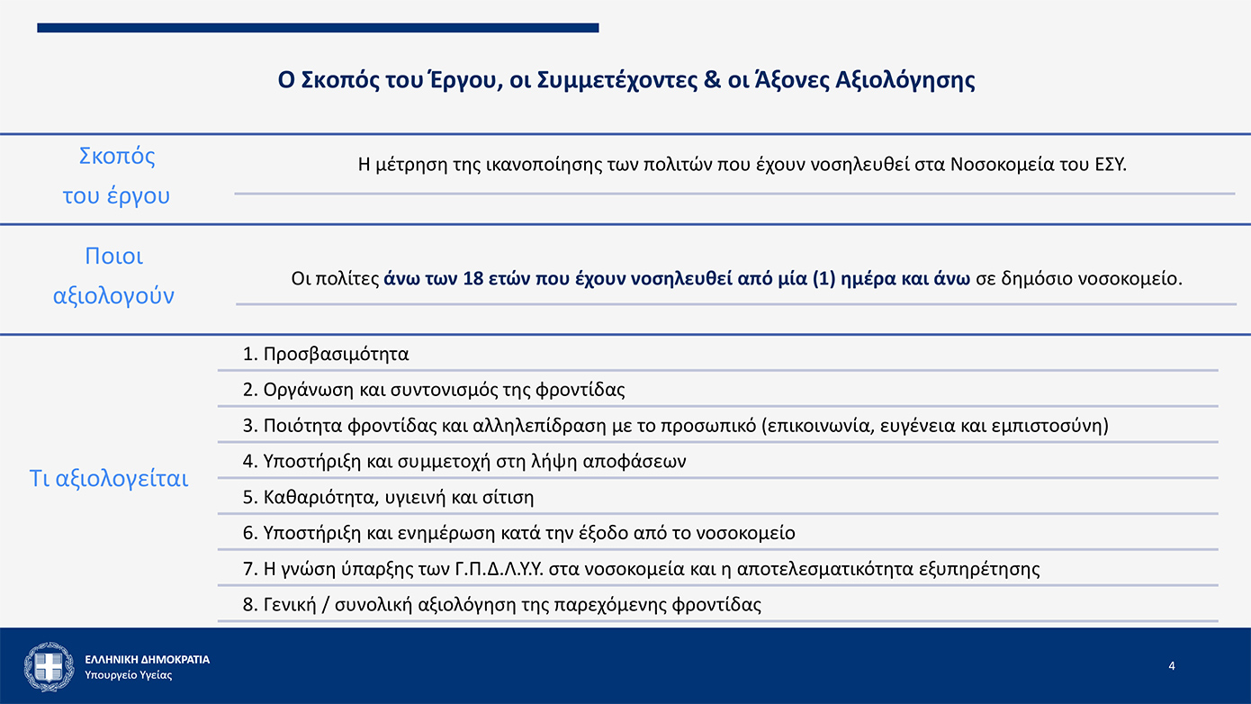 Όταν είχαμε συζητήσει με τον υπουργό πριν από κάποιους μήνες τον τρόπο με τον οποίο θα αξιολογούμε τις παρεχόμενες υπηρεσίες του Εθνικού Συστήματος Υγείας, συμφωνήσαμε από κοινού ότι πρέπει, πρώτα και πάνω απ΄ όλα, να ρωτούμε αναλυτικά τους ίδιους τους χρήστες του συστήματος.