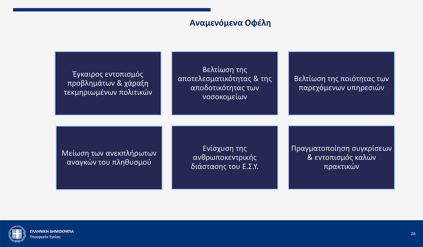 »Το έργο αυτό χρηματοδοτείται από το Ταμείο Ανάκαμψης και θα αποτελεί ένα σταθερό σημείο αναφοράς ως προς την αξιοποίηση των δεδομένων, για να μπορούμε να εντοπίζουμε προβλήματα και να εστιάζουμε κι εμείς τις δικές μας πρωτοβουλίες με βάση τις προτεραιότητες που οι ίδιοι οι πολίτες, οι χρήστες του Εθνικού Συστήματος Υγείας μάς υποδεικνύουν.