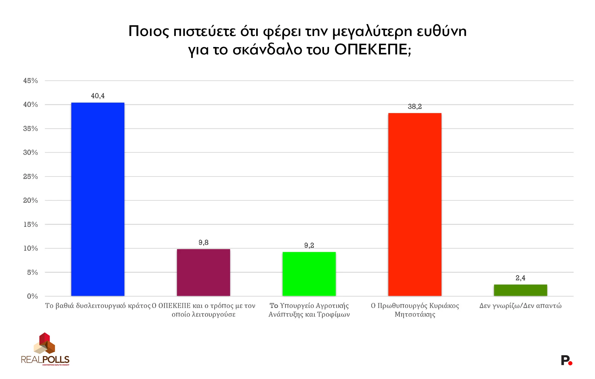 Στην ερώτηση «Ποιος πιστεύετε ότι φέρει τη μεγαλύτερη ευθύνη για το σκάνδαλο του ΟΠΕΚΕΠΕ», η κοινή γνώμη εμφανίζεται μοιρασμένη και πιστεύει ότι κατά 40,4% την ευθύνη φέρει το «βαθιά δυσλειτουργικό κράτος» και κατά 38,2% ο ίδιος ο Πρωθυπουργός. Σε πολύ μικρότερα ποσοστά, στη σφαίρα του 9-10%, οι πολίτες πιστεύουν ότι η ευθύνη βαρύνει το υπουργείο Αγροτικής Ανάπτυξης και τον ΟΠΕΚΕΠΕ.