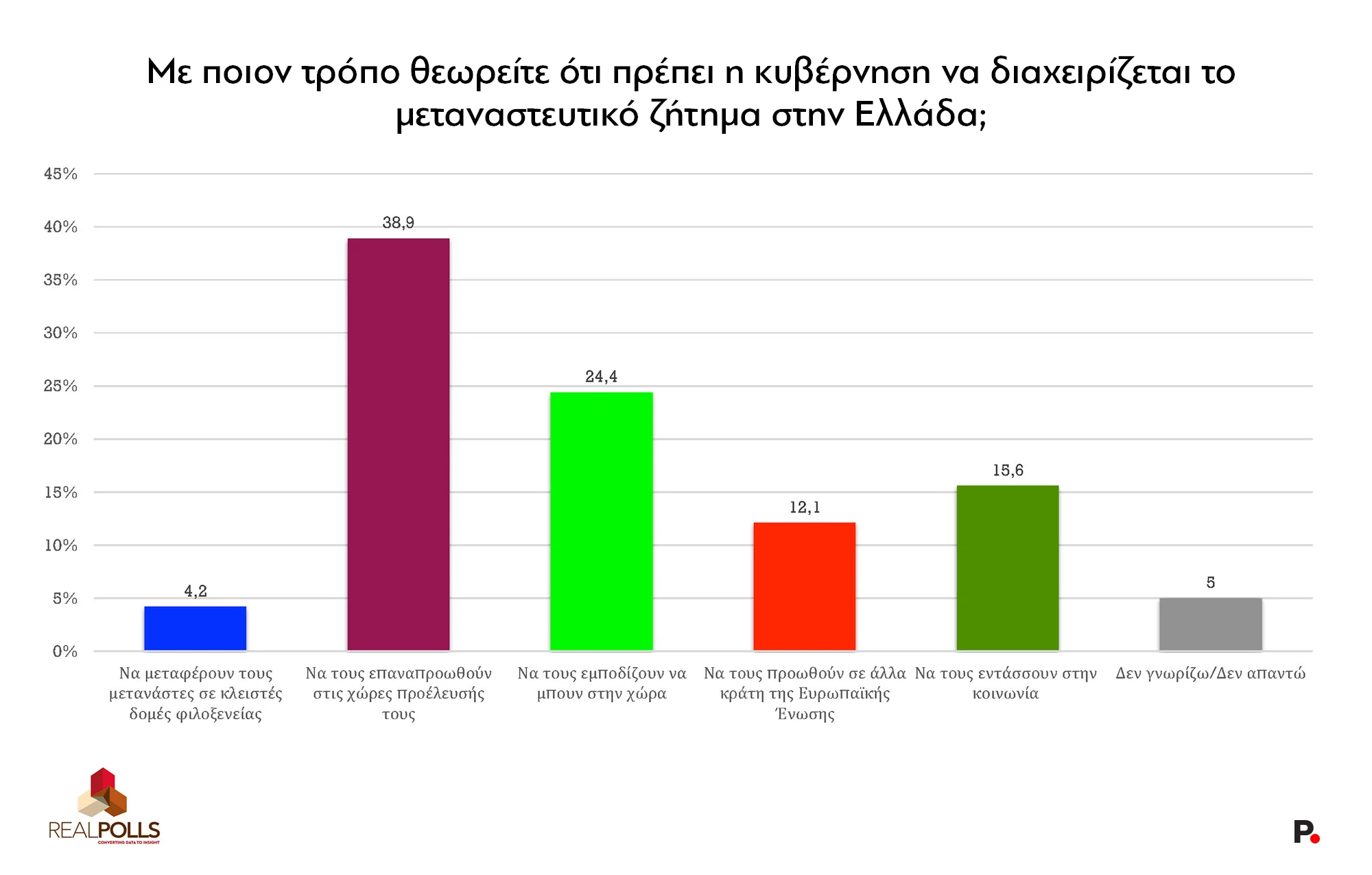 Όσον αφορά στο μεταναστευτικό, με αφορμή τις αυξημένες ροές στην Κρήτη, φαίνεται ότι η κοινή γνώμη επιδοκιμάζει τη σκληρή γραμμή της κυβέρνησης, με το 38,9% να υποστηρίζει την επαναπροώθηση μεταναστών στις χώρες προέλευσης και το 24,4% την παρεμπόδιση εισόδου τους στη χώρα.