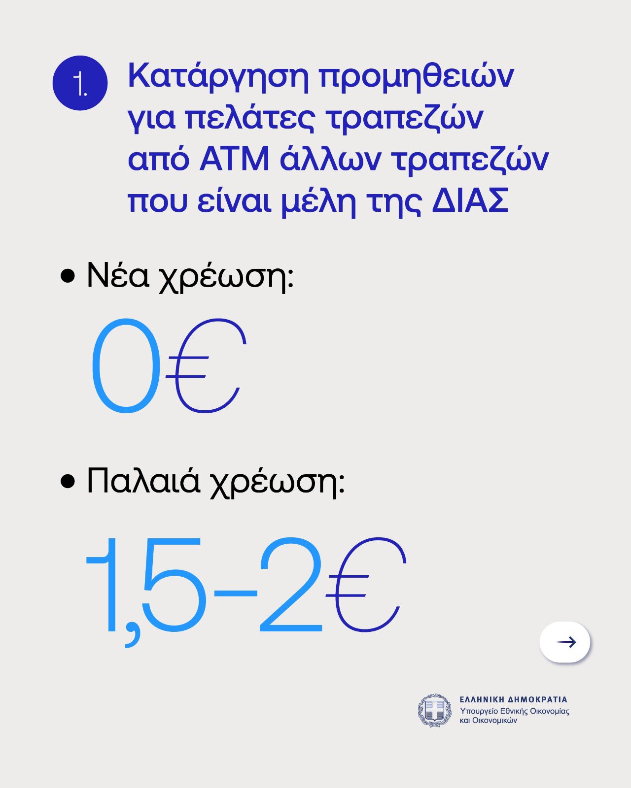 Τα μέτρα περιλαμβάνουν, μεταξύ άλλων, κατάργηση των προμηθειών για πελάτες τραπεζών σε ΑΤΜ άλλων καταστημάτων που είναι μέλη της ΔΙΑΣ.