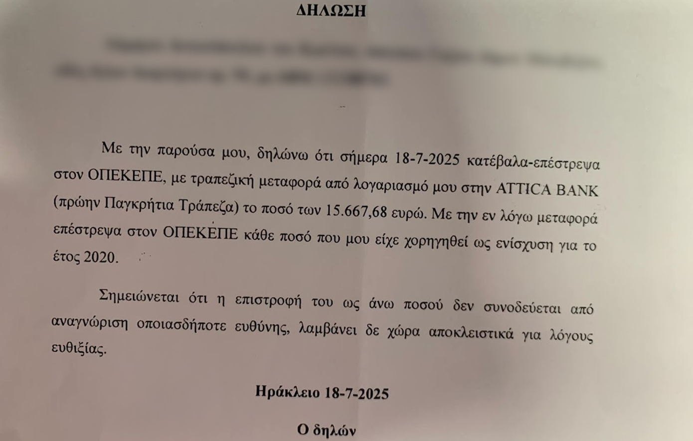 «Με την παρούσα μου, δηλώνω ότι σήμερα 18-7-2025 κατέβαλα-επέστρεψα στον ΟΠΕΚΕΠΕ, με τραπεζική μεταφορά από λογαριασμό μου στην ATTICA BANK (πρώην Παγκρήτια Τράπεζα) το ποσό των 15.667, 68 ευρώ. Με την εν λόγω μεταφορά επέστρεψα στον ΟΠΕΚΕΠΕ κάθε ποσό που μου έχει χορηγηθεί ως ενίσχυση για το έτος 2020.