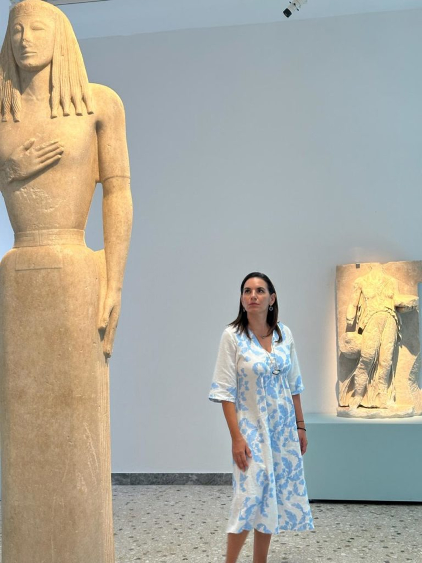 Η υπουργός ξεναγήθηκε αρχικά στο πλήρως ανακαινισμένο Αρχαιολογικό Μουσείο Θήρας όπου φιλοξενείται η εμβληματική έκθεση «Κυκλαδίτισσες – Άγνωστες Ιστορίες Γυναικών των Κυκλάδων», μια κορυφαία πολιτιστική πρωτοβουλία που φωτίζει τον ρόλο της γυναίκας στον κυκλαδικό χώρο από την προϊστορία έως και τον 19ο αιώνα.