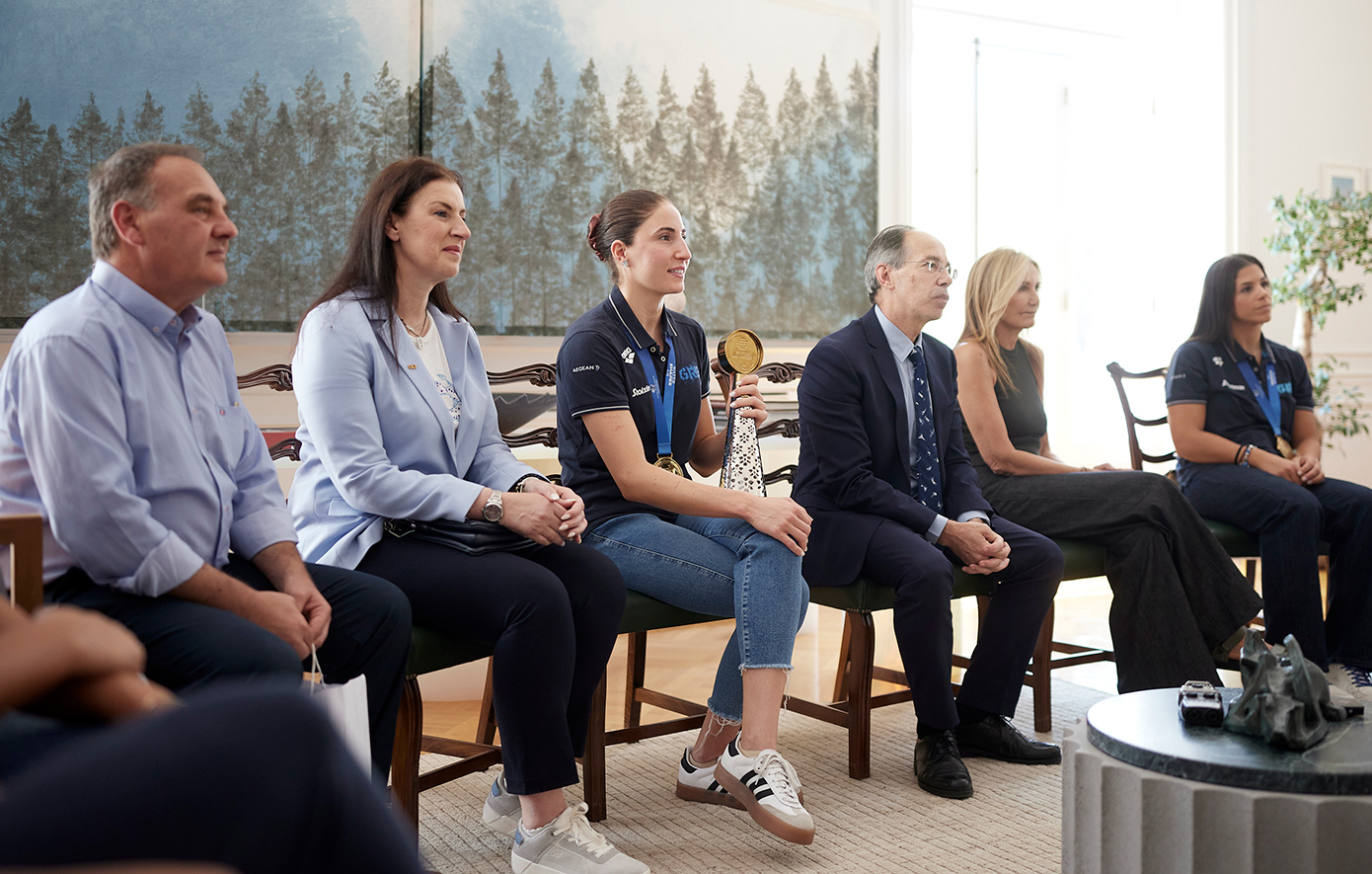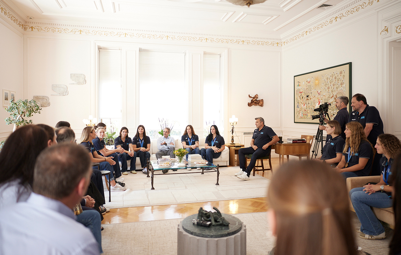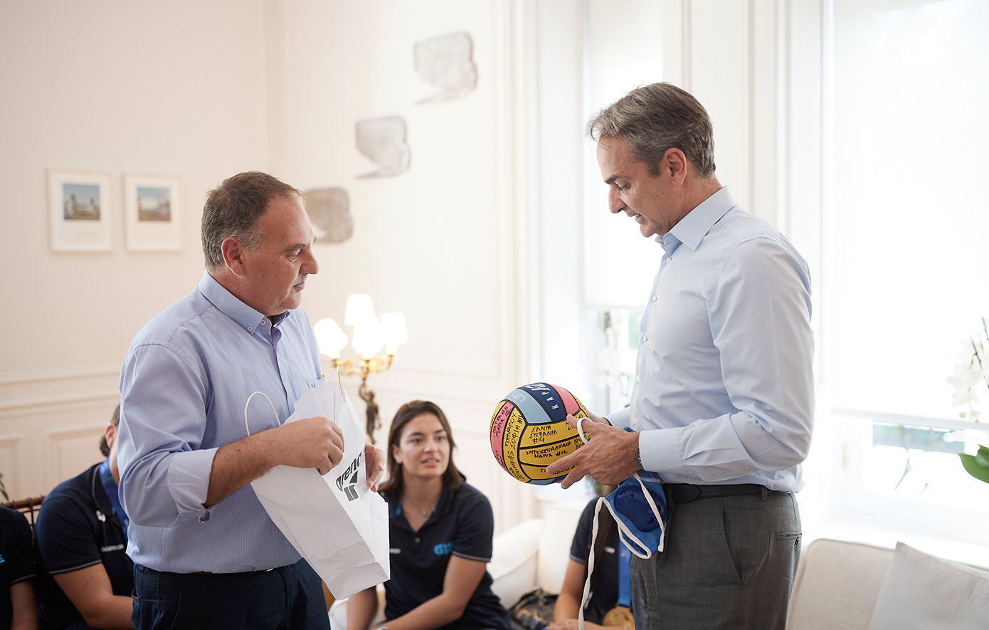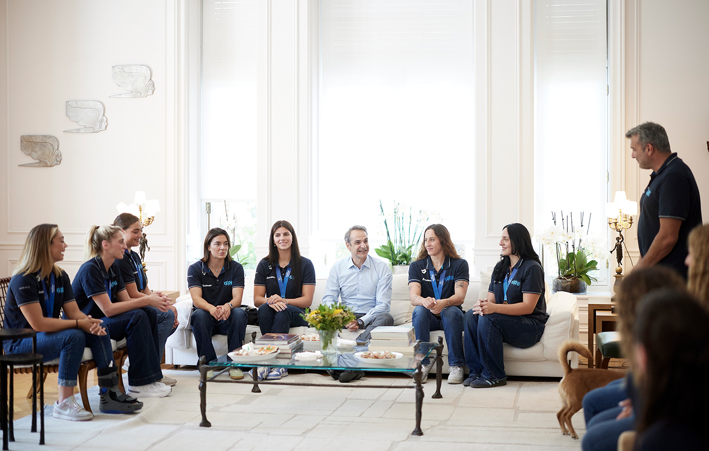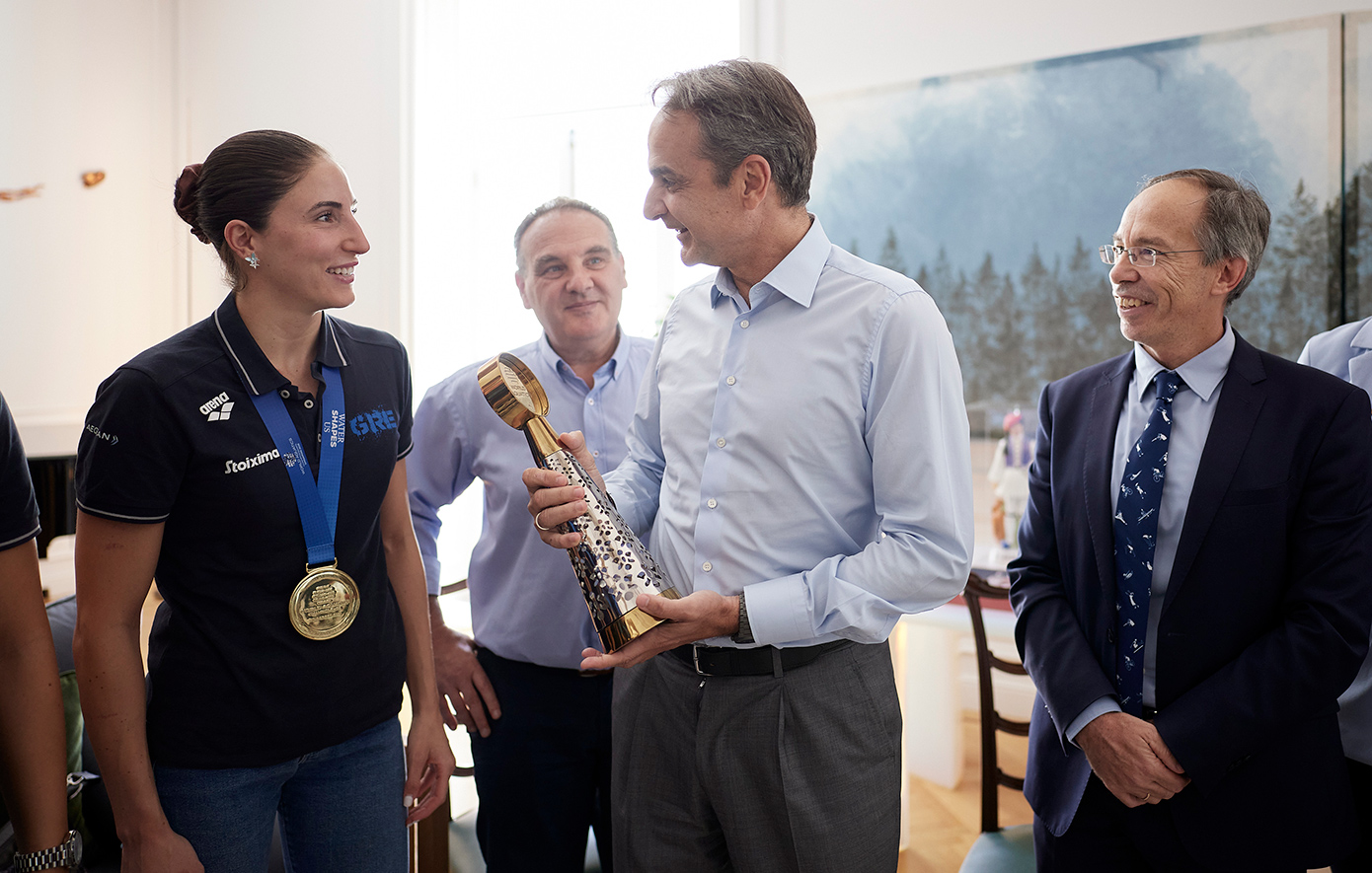 Ο Κυριάκος Μητσοτάκης και η σύζυγός του Μαρέβα Γκραμπόφσκι – Μητσοτάκη υποδέχτηκαν σήμερα στο Μέγαρο Μαξίμου την εθνική ομάδα πόλο γυναικών, η οποία πριν λίγες ημέρες κατέκτησε το χρυσό μετάλλιο στο Παγκόσμιο Πρωτάθλημα στη Σιγκαπούρη.