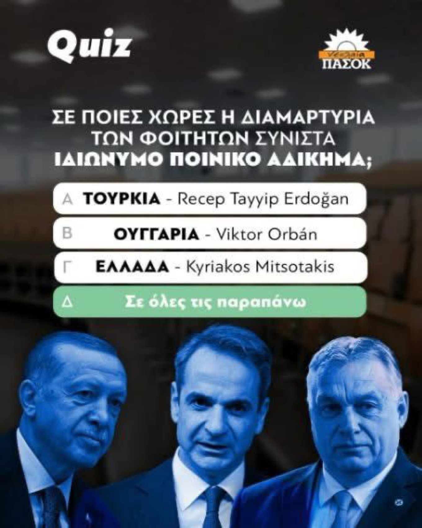 Στην ίδια ανακοίνωση, η κ. Σδούκου καλεί τον πρόεδρο του ΠΑΣΟΚ να πάρει θέση: «Το ερώτημα για τον πρόεδρο του ΠΑΣΟΚ κ. Ανδρουλάκη είναι σαφές: Θα αποκηρύξει, άμεσα, το περιεχόμενο της συγκεκριμένης αφίσας της Νεολαίας του κόμματός του ή θα συνεχίσει να κάνει ότι δεν βλέπει και δεν ακούει; Αν δεν το κάνει, θα καταστήσει για ακόμα μία φορά σαφές ότι για εκείνον ο χρόνος έχει σταματήσει στην περίοδο που πρωταγωνιστούσε στη Νεολαία ΠΑΣΟΚ και πρωτοστατούσε στο μπλοκάρισμα της αναθεώρησης του άρθρου 16 και στη διατήρηση του ασύλου ανομίας, στο όνομα του οποίου διαπράχθηκαν αμέτρητα εγκλήματα μειοψηφιών σε βάρος της σιωπηρής πλειοψηφίας των φοιτητών».