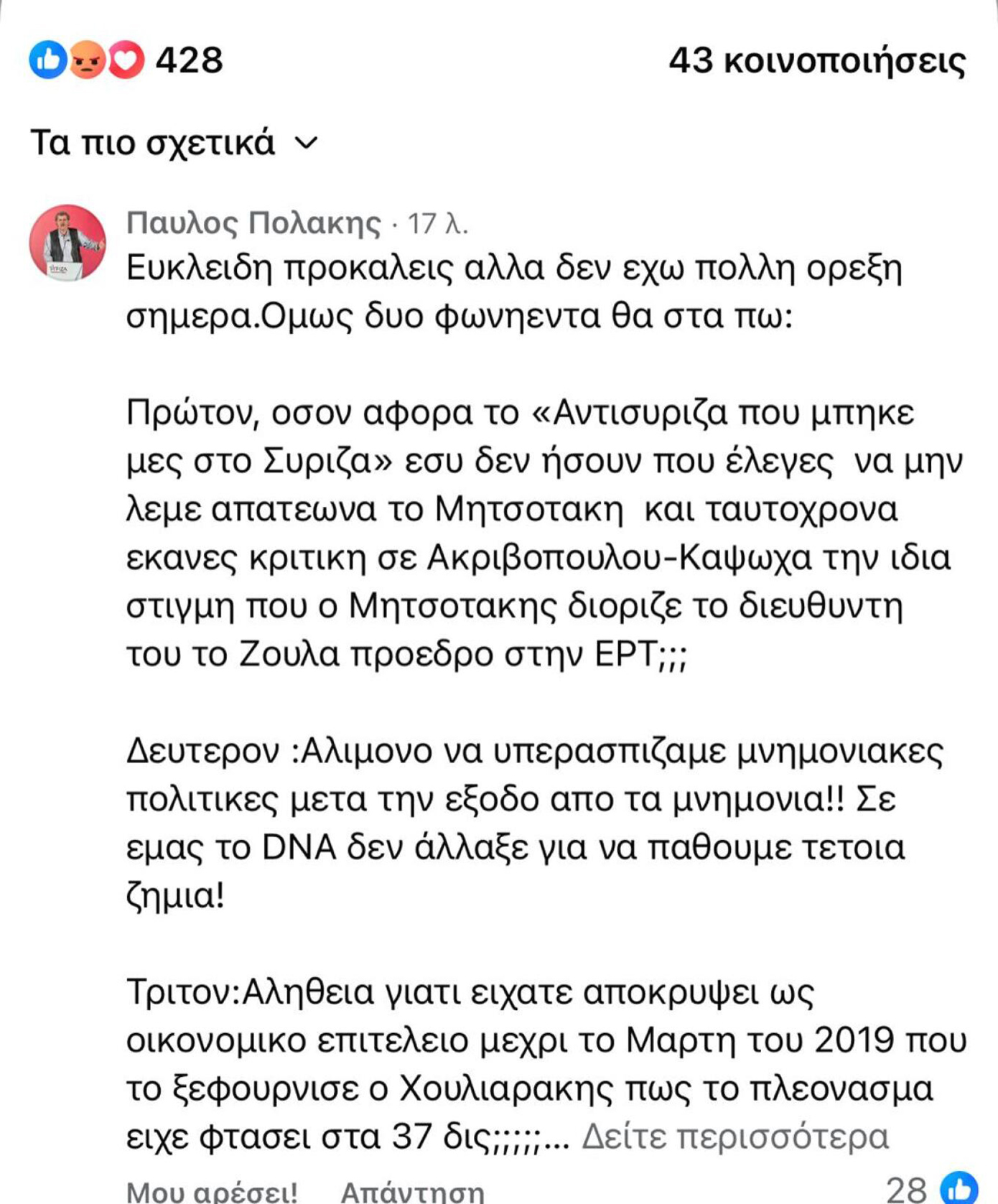 Ο Παύλος Πολάκης απάντησε στην ανάρτηση Τσακαλώτου με πέντε επισημάνσεις ή ερωτήματα για να καταλήξει: «Άντε γιατί η αριστεροσύνη σας στα πραγματικά ΕΠΙΔΙΚΑ είναι τύπου “σφυρίξτε κλέφτικα” ενώ στα ακίνδυνα τύπου “δικαιωματικά” κάνετε σαν τζιτζίκια τον Αύγουστο!!».
