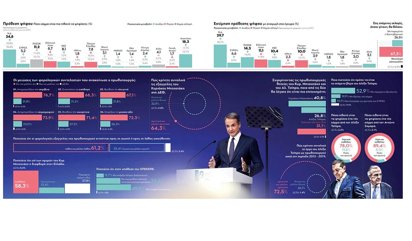 Συγκεκριμένα, το 32,9% του συνόλου κρίνει θετικά και μάλλον θετικά τις πρωθυπουργικές εξαγγελίες, ενώ το 35,4% πιστεύει ότι οι φορολογικές μεταρρυθμίσεις που παρουσίασε ο Κ. Μητσοτάκης κινούνται προς τη σωστή κατεύθυνση. Η μεγάλη πλειοψηφία, βέβαια, συνεχίζει να τοποθετείται αρνητικά απέναντι στο πακέτο των εξαγγελιών, ωστόσο το ποσοστό που κρίνει θετικά τα φορολογικά μέτρα μπορεί να θεωρηθεί μια καλή επίδοση για το κυβερνητικό στρατόπεδο.