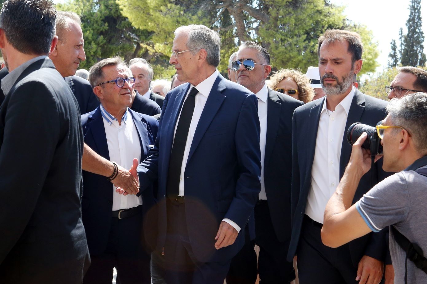 Με εμφανή συγκίνηση, ο πρώην πρωθυπουργός Αντώνης Σαμαράς, η σύζυγός του Γεωργία και ο γιος τους Κωνσταντίνος έφτασαν στην εκκλησία των Αγίων Θεοδώρων, όπου τελείται η τελετή.