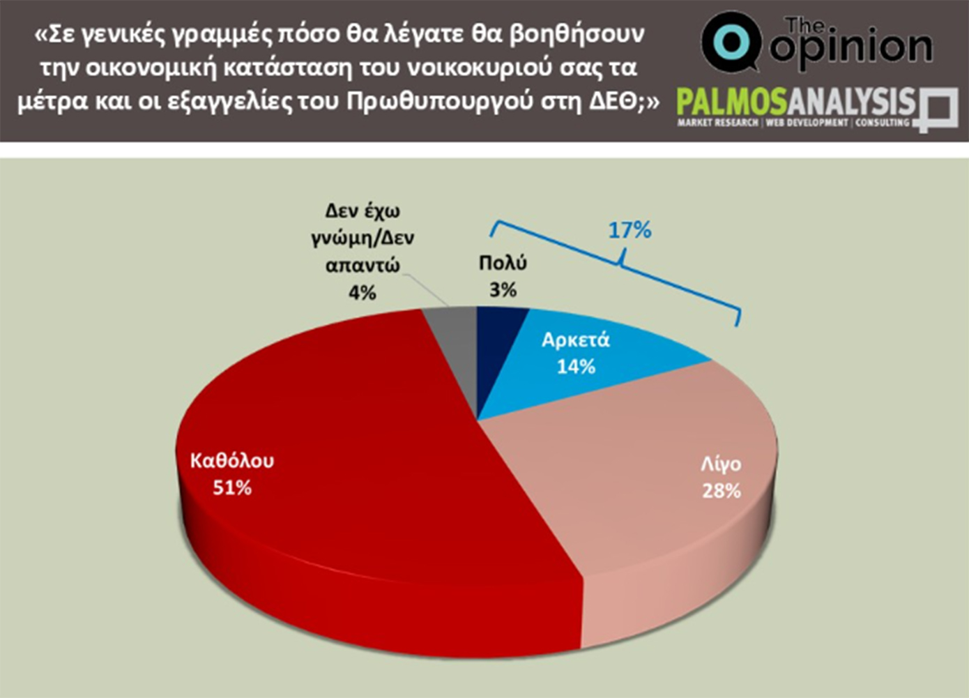 Τέλος, αξίζει να σημειωθεί η έντονη επιφυλακτικότητα των πολιτών απέναντι στις εξαγγελίες της κυβέρνησης για την οικονομία. Στο ερώτημα κατά πόσο θεωρούν ότι τα μέτρα που ανακοινώθηκαν στη ΔΕΘ θα βοηθήσουν την οικονομική κατάσταση του νοικοκυριού τους, το 51% απάντησε «καθόλου», το 28% «λίγο», και μόλις το 17% «αρκετά» ή «πολύ».