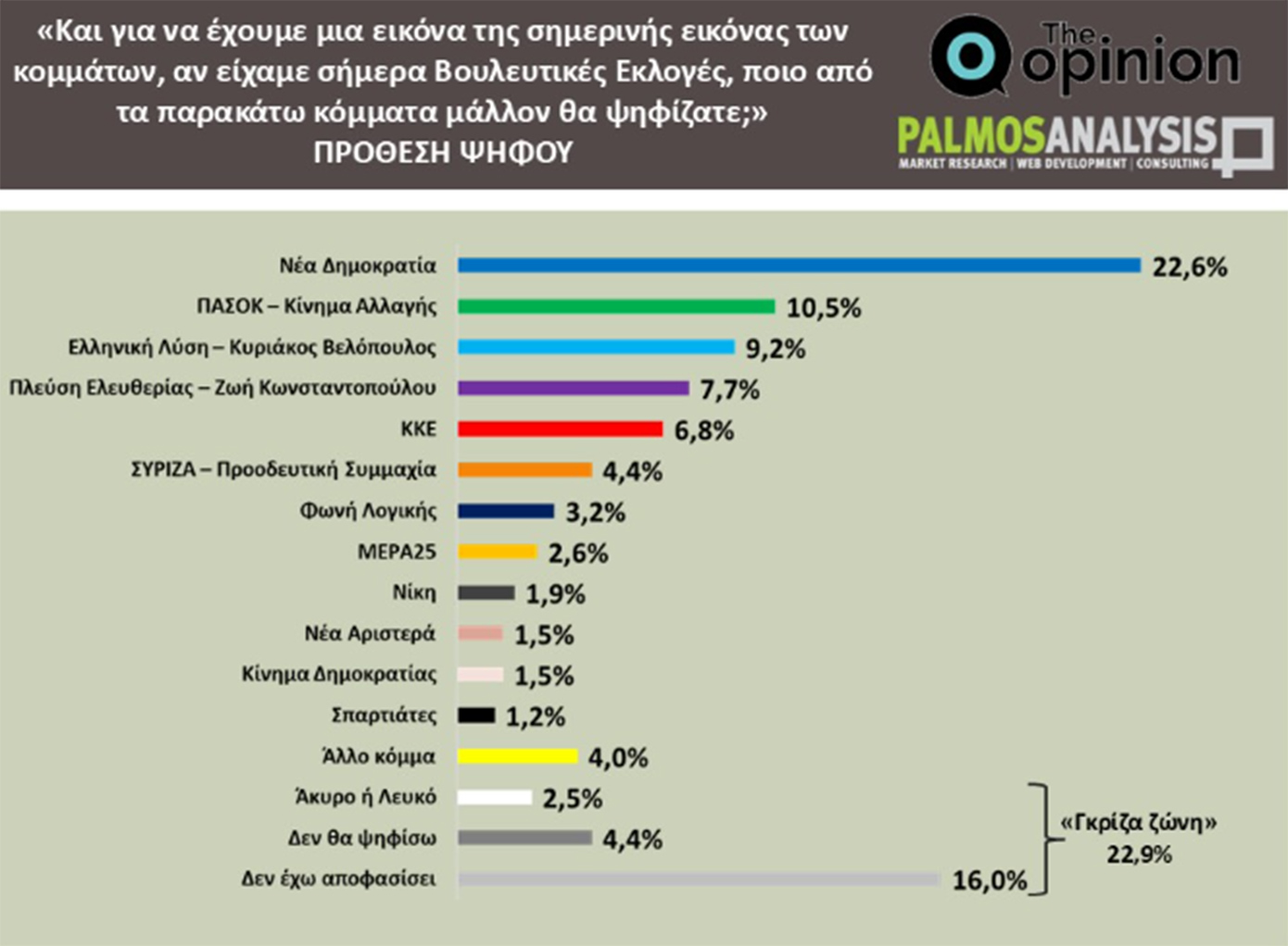 Σύμφωνα με τη δημοσκόπηση της Palmos Analysis για την ιστοσελίδα TheOpinion.gr, στην εκτίμηση εκλογικής επιρροής, η Νέα Δημοκρατία προηγείται με 29,3%, ενώ στην πρόθεση ψήφου συγκεντρώνει 22,6%. Ακολουθούν το ΠΑΣΟΚ (13,6% και 10,5% αντίστοιχα), η Ελληνική Λύση, η Πλεύση Ελευθερίας, το ΚΚΕ και με σαφώς μειωμένα ποσοστά ο ΣΥΡΙΖΑ. Ο πολιτικός χάρτης εμφανίζει έντονο κατακερματισμό, που επιτρέπει στη ΝΔ να διατηρεί διψήφια διαφορά, παρά τις απώλειες.