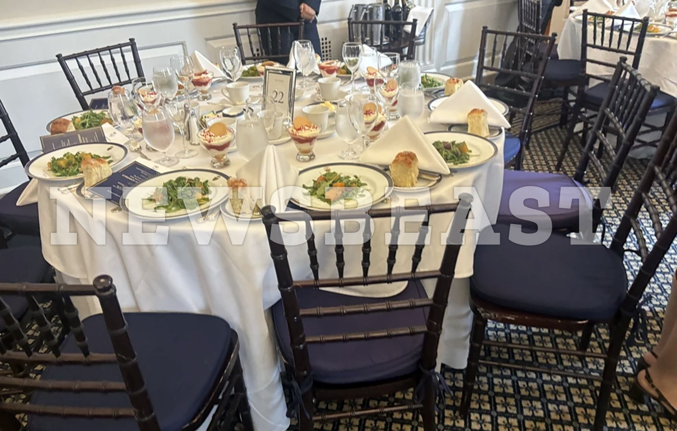 Η σαλάτα ήταν με ρόκα, παντζάρια και ελαφρά ψημένα κόκκινα σταφύλια με ντρέσινγκ από φιστίκι. Το κυρίως πιάτο ήταν στήθος ψητού κοτόπουλου μέσα σε κρούστα άγριων μανιταριών και θυμάρι. Το επιδόρπιο ήταν ένα υπέροχο γλυκό με φράουλες και κρέμα.