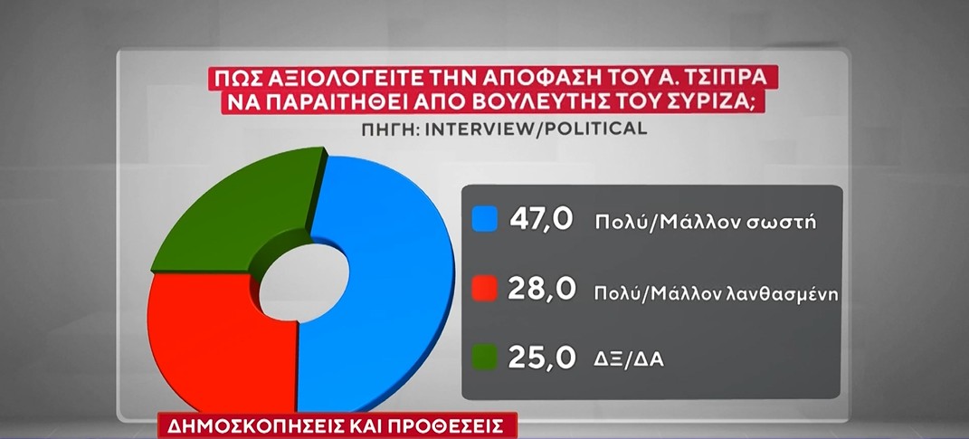 Οι συμμετέχοντες στη δημοσκόπηση ερωτήθηκαν και για την απόφαση του Αλέξη Τσίπρα να παραιτηθεί από το βουλευτικό του αξίωμα. Το 47% εκτιμά ότι ήταν «πολύ/μάλλον σωστή» απόφαση, το 28% θεωρεί την κίνηση «πολύ, μάλλον λανθασμένη», ενώ το 25% απαντά «ΔΞ/ΔΑ».