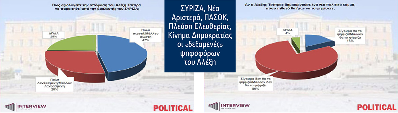 Ένα νέο κόμμα υπό τον πρώην πρωθυπουργό, Αλέξη Τσίπρα, θα αντλήσει δυνάμεις από τις υπάρχουσες «δεξαμενές» του ΣΥΡΙΖΑ, της Νέας Αριστεράς, της Πλεύσης Ελευθερίας και άλλων κομμάτων, όπως προκύπτει από τη νέα δημοσκόπηση της Interview για λογαριασμό της εφημερίδας «Political», η οποία διενεργήθηκε από 1 έως 8 Οκτωβρίου. Σύμφωνα με τα σχετικά ευρήματα, περίπου ένας στους πέντε ερωτηθέντες απαντά ότι θα ψήφιζε ένα νέο κόμμα υπό τον Αλέξη Τσίπρα.