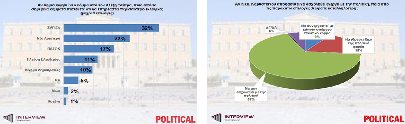 Εντωμεταξύ, στην ερώτηση «αν η κ. Καρυστιανού αποφασίσει να ασχοληθεί ενεργά με την πολιτική, ποια από τις παρακάτω επιλογές θεωρείτε καταλληλότερη;», το 67% απαντά «να μην ασχοληθεί με την πολιτική», έναντι 18% που απαντά «να ιδρύσει δικό της πολιτικό φορέα», 9% που θεωρεί ότι θα πρέπει να συνεργαστεί με κάποιο από τα υπάρχοντα κόμματα και 6% που απαντά «δεν ξέρω/δεν απαντώ».
