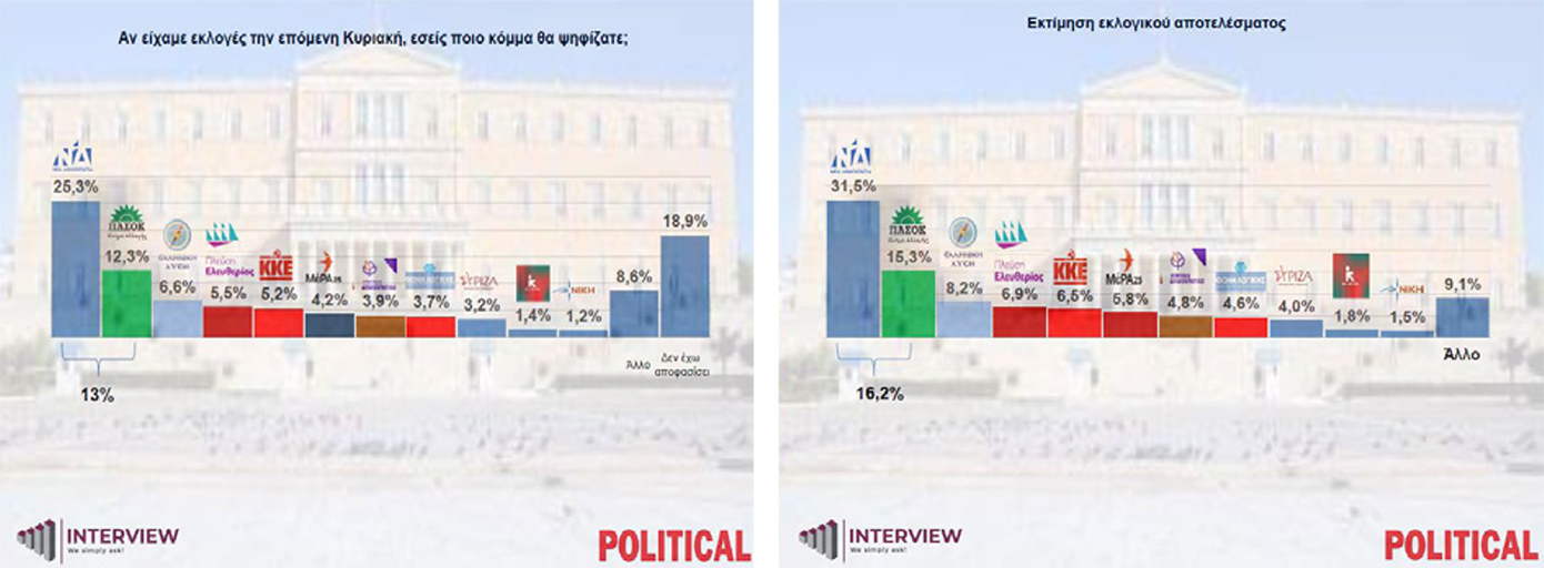 Ειδικότερα, στην πρόθεση ψήφου, η ΝΔ εξασφαλίζει ποσοστό 25,3%, έναντι 12,3% του ΠΑΣΟΚ, 6,6% της Ελληνικής Λύσης, 5,5% της Πλεύσης Ελευθερίας, 5,2% του ΚΚΕ, 4,2% του ΜέΡΑ25, 3,9% του Κινήματος Δημοκρατίας, 3,7% της Φωνής Λογικής, 3,2% του ΣΥΡΙΖΑ, 1,4% της Νέας Αριστεράς, 1,2% της Νίκης, ενώ 8,6% των ερωτηθέντων απαντά «άλλο» και 18,9% ότι δεν έχει αποφασίσει. Στην εκτίμηση εκλογικού αποτελέσματος, η ΝΔ εξασφαλίζει 31,5%, το ΠΑΣΟΚ 15,3%, η Ελληνική Λύση 8,2%, η Πλεύση Ελευθερίας 6,9%, το ΚΚΕ 6,5%, το ΜέΡΑ25 5,8%, το Κίνημα Δημοκρατίας 4,8%, η Φωνή Λογικής 4,6%, ο ΣΥΡΙΖΑ 4%, η Νέα Αριστερά 1,8%, η Νίκη 1,5%, ενώ ποσοστό 9,1% απαντά «άλλο».