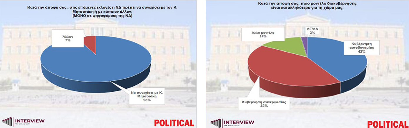 Στη δημοσκόπηση δίνεται επίσης απάντηση στα σενάρια περί αλλαγής ηγεσίας στη ΝΔ, με ποσοστό 93% να απαντά ότι η κυβερνητική παράταξη πρέπει να συνεχίσει με τον Κυριάκο Μητσοτάκη στις επόμενες εκλογές, έναντι μόλις 7% που απαντά «με άλλον».