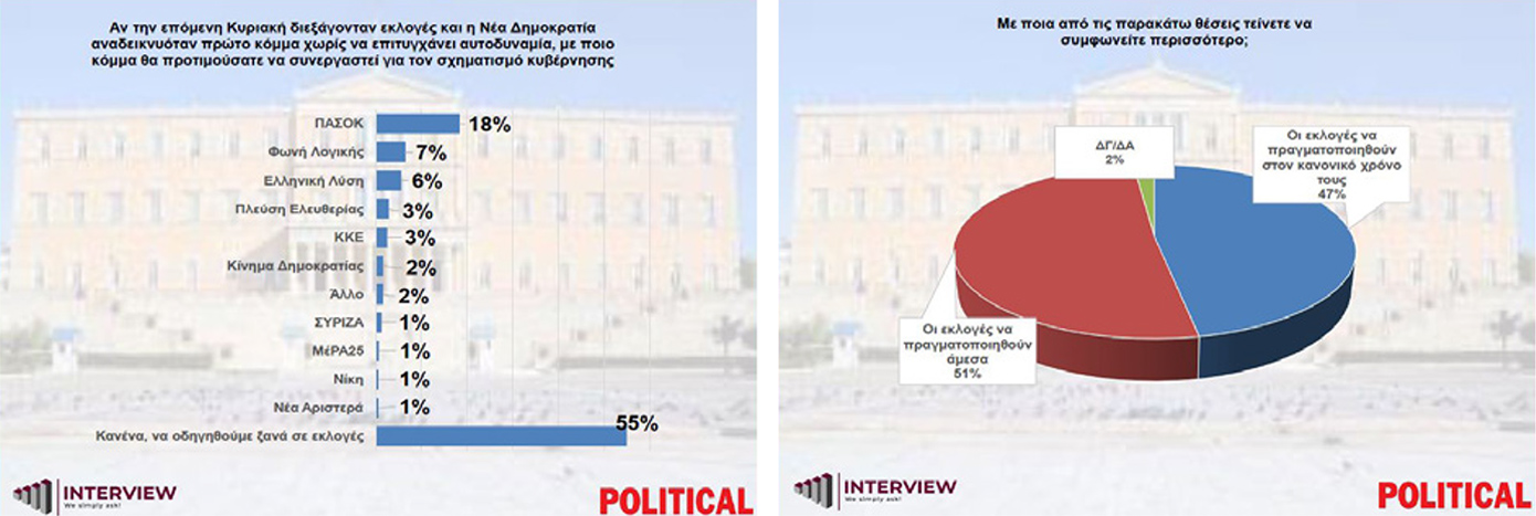 Στην ερώτηση «αν την επόμενη Κυριακή διεξάγονταν εκλογές και η ΝΔ αναδεικνυόταν πρώτο κόμμα χωρίς να επιτυγχάνει αυτοδυναμία, με ποιο κόμμα θα προτιμούσατε να συνεργαστεί για τον σχηματισμό κυβέρνησης;», το 18% απαντά με το ΠΑΣΟΚ, το 7% με τη Φωνή Λογικής, το 6% με την Ελληνική Λύση, το 3% με την Πλεύση Ελευθερίας, το 3% με το ΚΚΕ, το 2% με το Κίνημα Δημοκρατίας, «άλλο» απαντά ένα 2%, με τον ΣΥΡΙΖΑ 1%, με το ΜέΡΑ25 1%, με τη Νίκη 1%, με τη Νέα Αριστερά 1%, ενώ το 55% ζήτησε να οδηγηθούμε ξανά σε εκλογές.