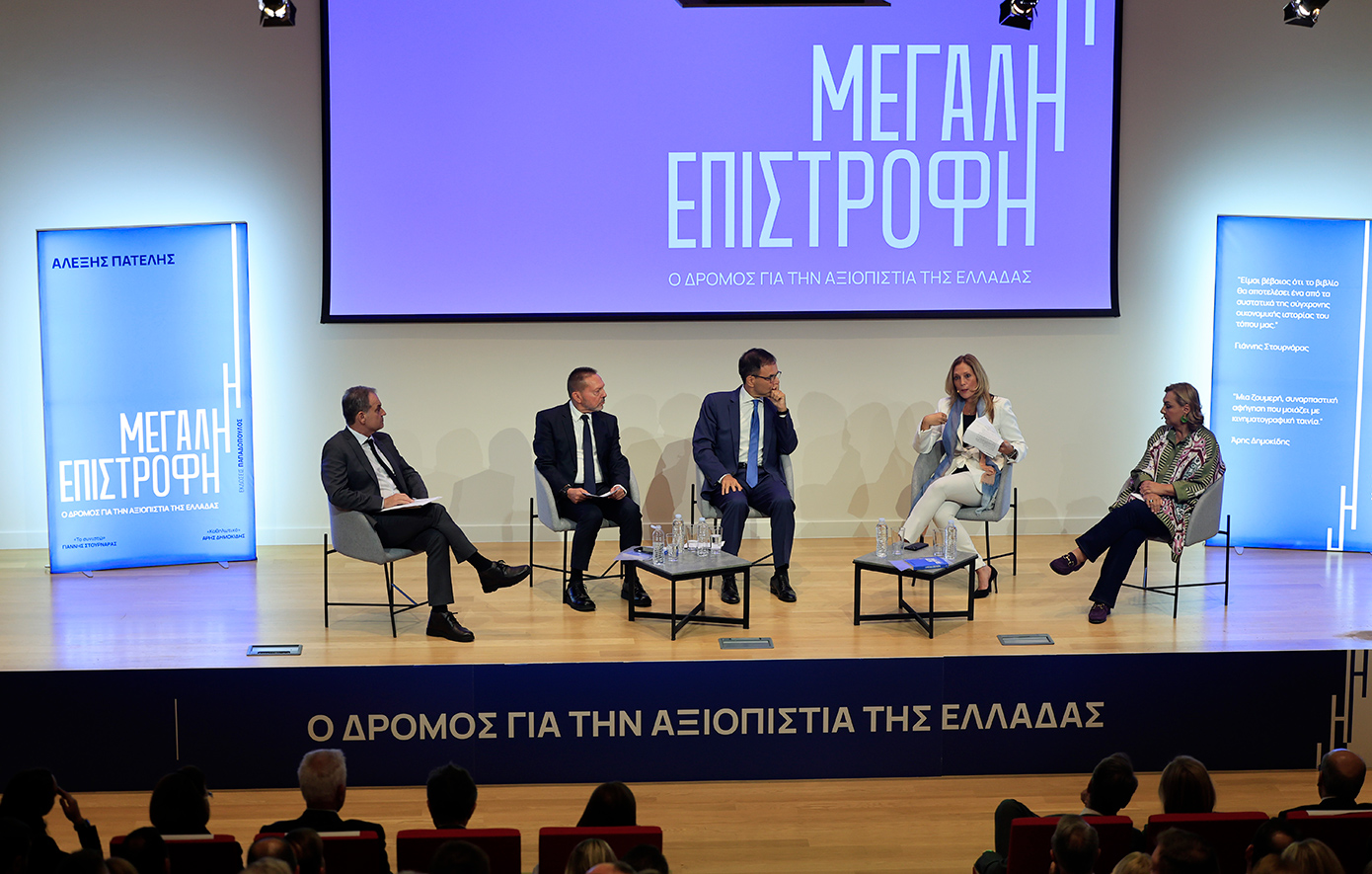 Στην ομιλία του, ο συγγραφέας και πρώην επικεφαλής του Οικονομικού Γραφείου του Πρωθυπουργού (2019–2024), Αλέξης Πατέλης, υπογράμμισε πως «Η Μεγάλη Επιστροφή» είναι αυτή της Ελλάδας: «Η χώρα μας έχει διανύσει έναν μακρύ δρόμο. Το βιβλίο αφηγείται πώς κερδίσαμε ξανά την αξιοπιστία μας διεθνώς, φτάνοντας στην επενδυτική βαθμίδα και στο εξώφυλλο του Economist ως “Χώρα της Χρονιάς”. Αυτό που ακούμε πλέον στο εξωτερικό είναι: “Πώς τα καταφέρατε εσείς οι Έλληνες;”»