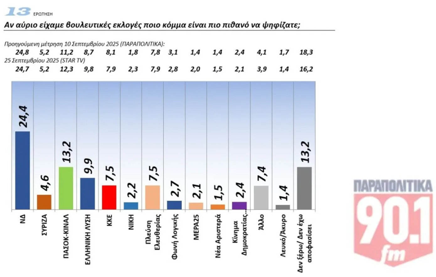 Στη μέτρηση της GPO για τα Παραπολιτικά FM, η Ελληνική Λύση καταγράφει 11,5%, το ΚΚΕ 8,8%, η Πλεύση Ελευθερίας 8,8%, ενώ ο ΣΥΡΙΖΑ φτάνει στο 5,4%. Ακολουθούν η Φωνή Λογικής με 3,2%, το Κίνημα Δημοκρατίας με 2,8%, η Νίκη με 2,6%, το ΜεΡΑ25 με 2,5% και η Νέα Αριστερά με 1,8%.