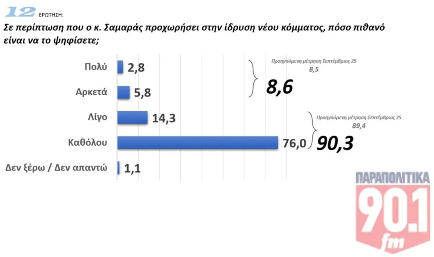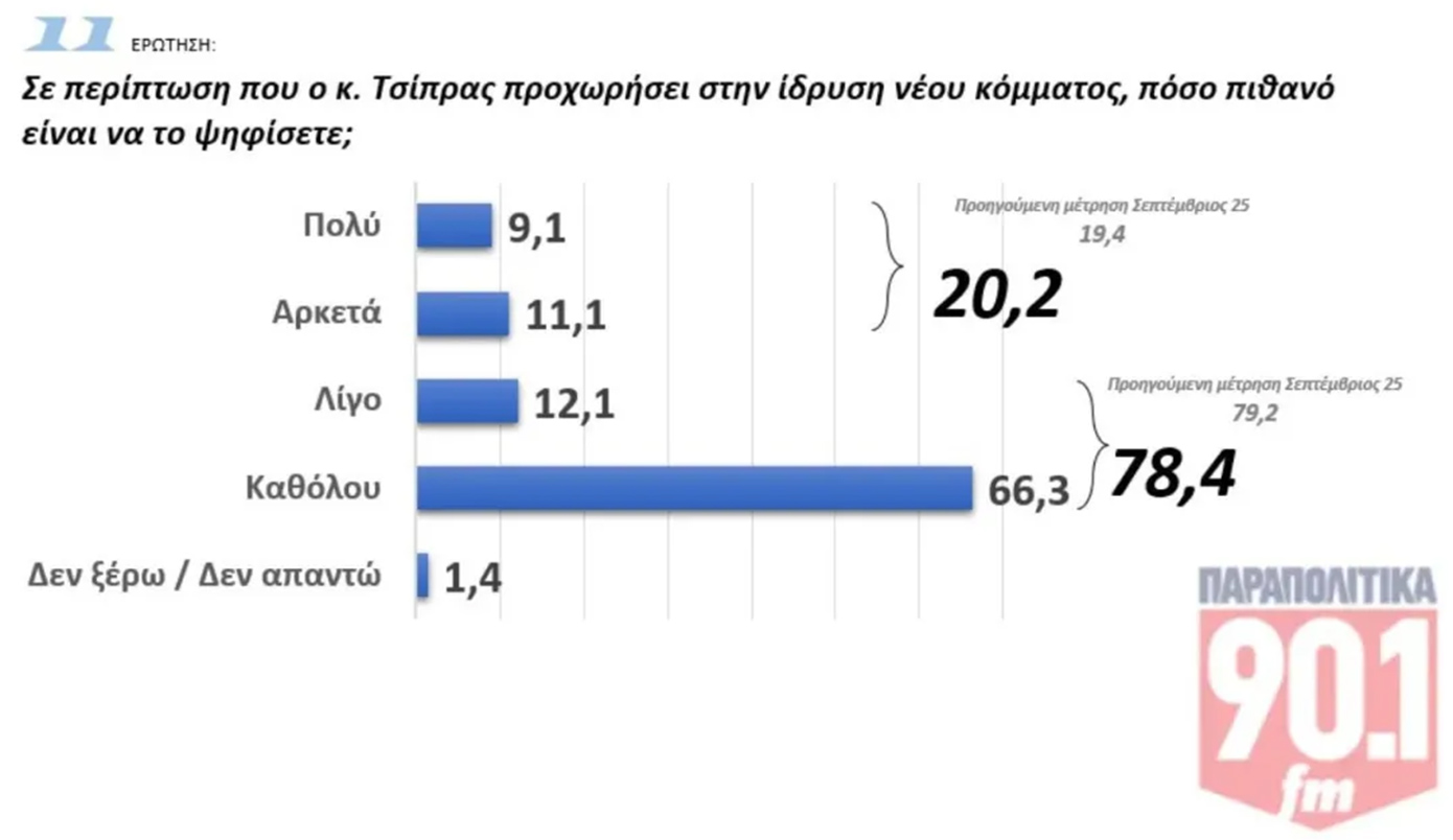 Η έρευνα περιλαμβάνει και ερωτήματα για ενδεχόμενη ίδρυση νέων κομμάτων από πρώην πρωταγωνιστές της πολιτικής σκηνής. Το 74,1% των ερωτηθέντων απαντά αρνητικά ή μάλλον αρνητικά για το αν ένα νέο κόμμα του Αλέξη Τσίπρα θα κάλυπτε το κενό στην αντιπολίτευση, ενώ μόνο το 23,9% απαντά θετικά ή μάλλον θετικά. Στην περίπτωση ίδρυσης κόμματος από τον Αντώνη Σαμαρά, το 78,1% απαντά όχι/μάλλον όχι και μόλις το 19,8% ναι/μάλλον ναι.