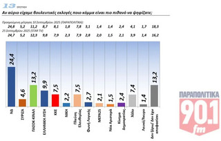 Στην πρόθεση ψήφου, η εικόνα διαφοροποιείται ελαφρώς: η Νέα Δημοκρατία σημειώνει 24,4%, το ΠΑΣΟΚ 13,2%, και η Ελληνική Λύση 9,9%. Την τέταρτη θέση μοιράζονται η Πλεύση Ελευθερίας και το ΚΚΕ με 7,5%. Ο ΣΥΡΙΖΑ καταγράφει 4,6%, η Φωνή Λογικής 2,7%, το Κίνημα Δημοκρατίας 2,4%, το ΜεΡΑ25 2,1% και η Νέα Αριστερά 1,5%.