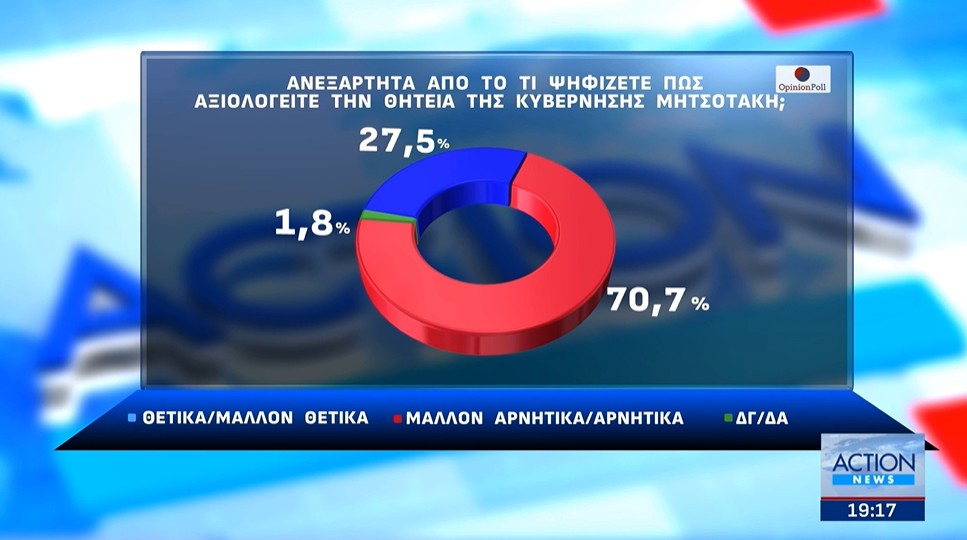 Επίσης, το 27,5% αξιολογεί θετικά το έργο της κυβέρνησης, ενώ το 70,7% διαφωνεί με τους κυβερνητικούς χειρισμούς.