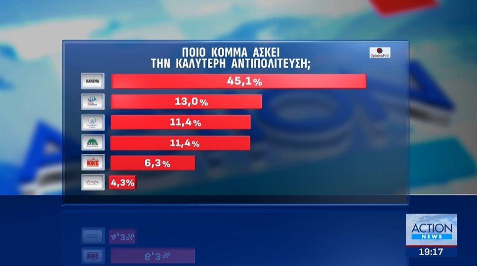 Επίσης, το 45% πιστεύει ότι κανένα κόμμα δεν ασκεί ικανοποιητική αντιπολίτευση.