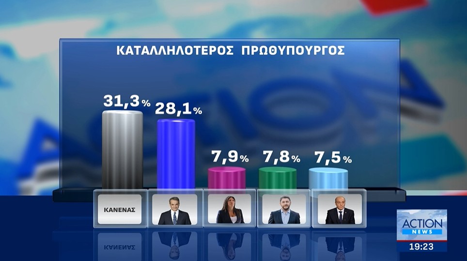Στο ερώτημα για καταλληλότερο πρωθυπουργό, το μεγαλύτερο ποσοστό το συγκεντρώνει ο «Κανένας» με 31,3%. Έπειτα, οι πολιτικοί αρχηγοί λαμβάνουν τα εξής ποσοστά: Κυριάκος Μητσοτάκης 28,1%, Νίκος Ανδρουλάκης 7,8% Ζωή Κωνσταντοπούλου 7,9%, Κυριάκος Βελόπουλος 7,5% και Σωκράτης Φάμελλος 1,8%.