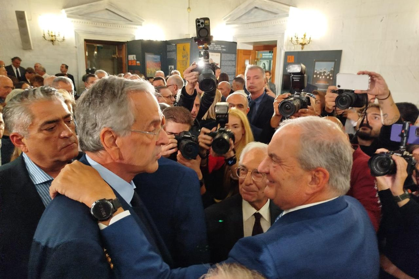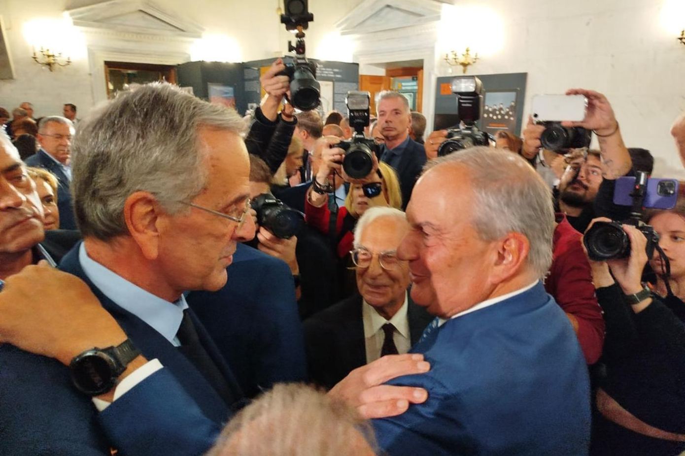 Μετά το πέρας της εκδήλωσης, οι δύο πρώην πρωθυπουργοί αντάλλαξαν έναν θερμό εναγκαλισμό, με τον φωτογραφικό φακό να καταγράφει το στιγμιότυπο.