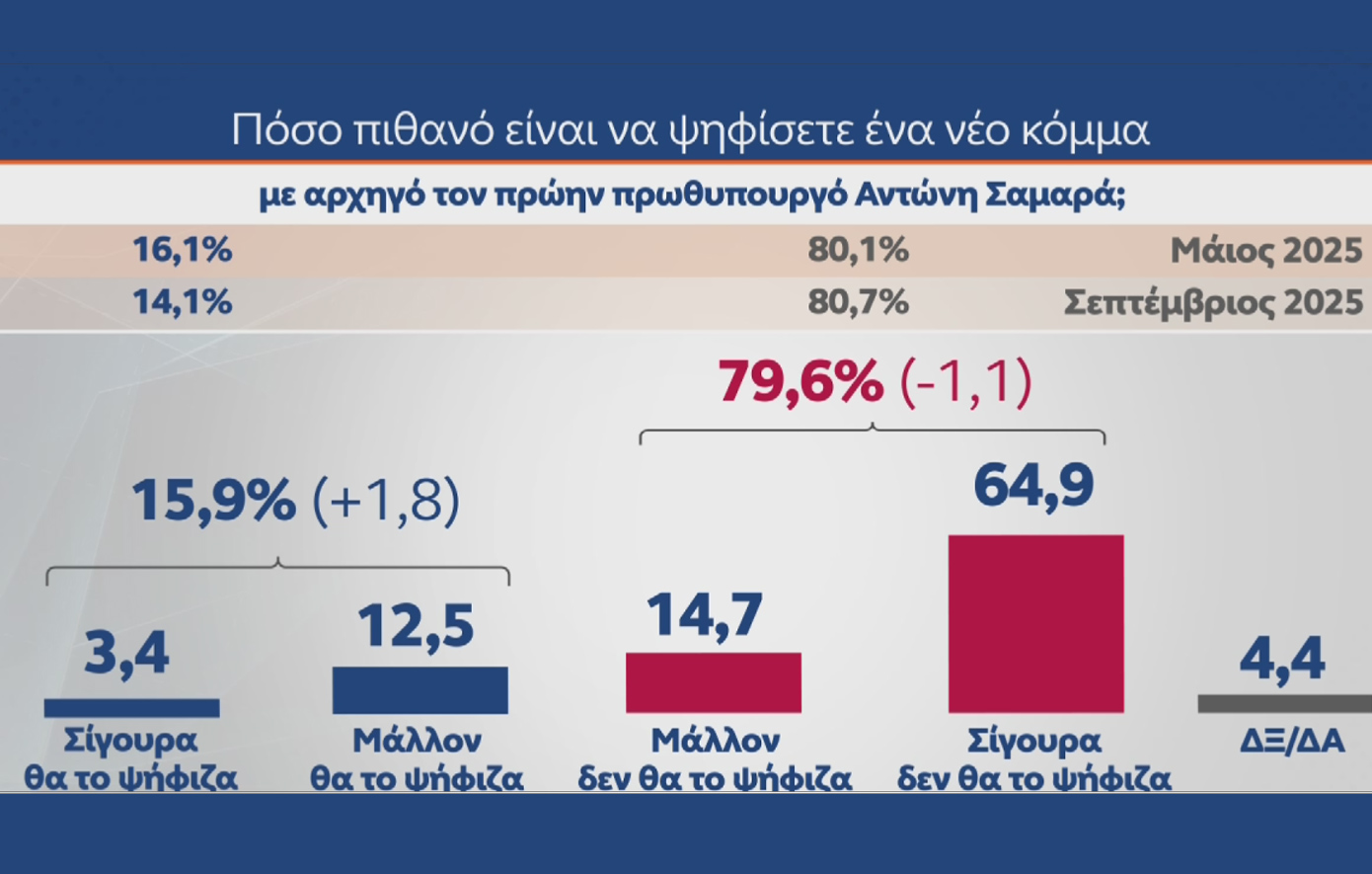 Τώρα, στην περίπτωση του Αντώνη Σαμαρά το 15,9% θα στήριζε ένα νέο πολιτικό φορέα υπό την ηγεσία του πρώην πρωθυπουργού, σε αντίθεση με το 79,6% που δεν θα ψήφιζε.