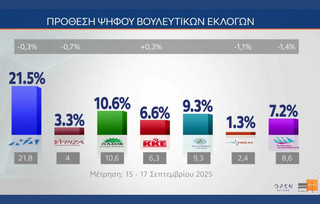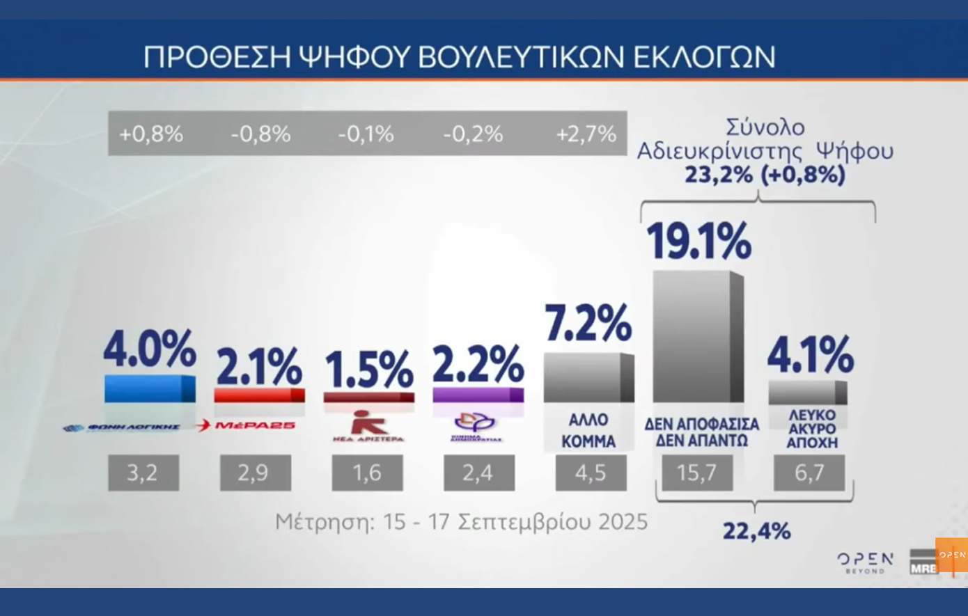 Στην πρόθεση ψήφου η Νέα Δημοκρατία προηγείται με διαφορά, ενώ τη δεύτερη θέση καταλαμβάνει το ΠΑΣΟΚ, αλλά κολλημένο σε ποσοστό 10,6%.