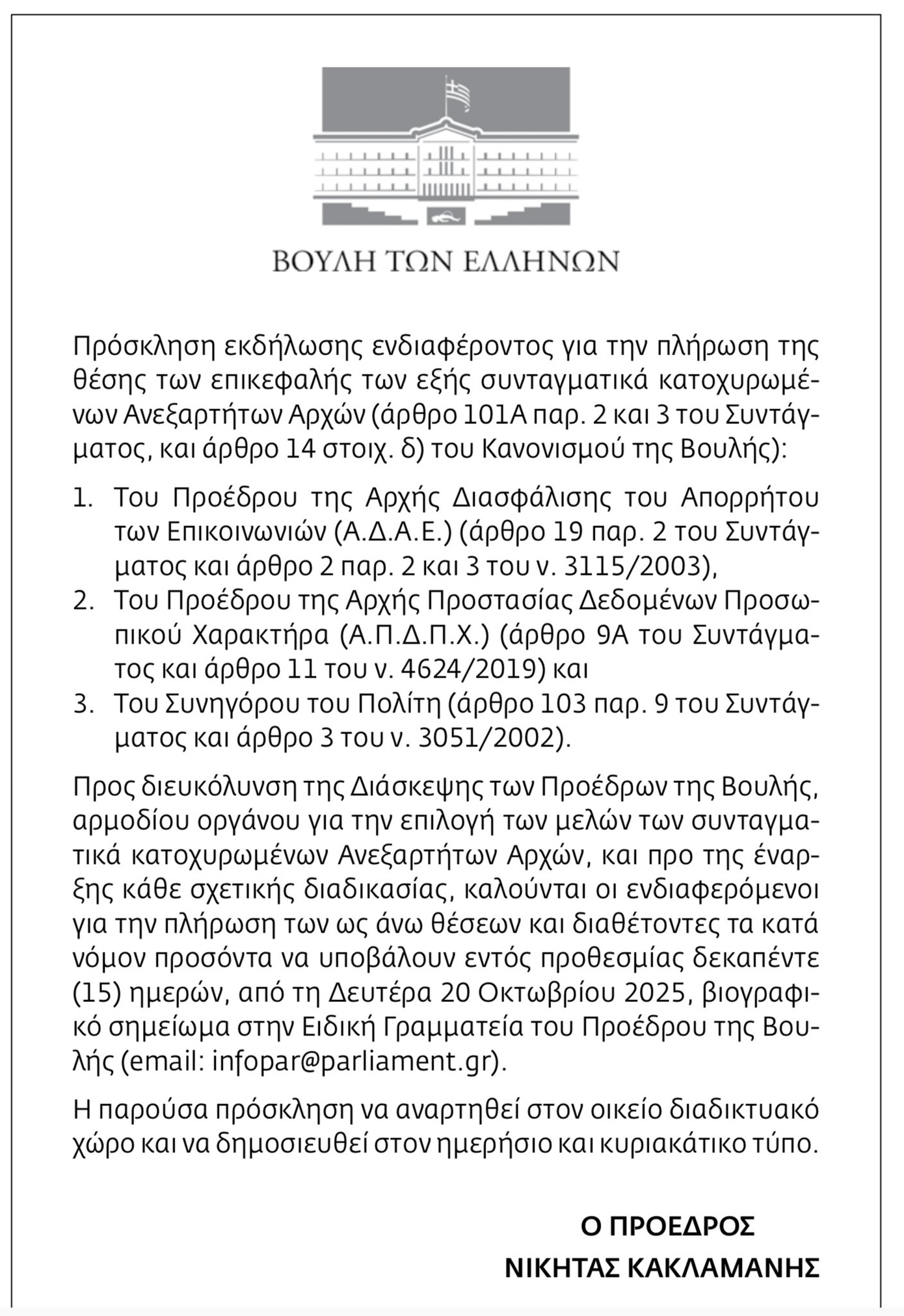 Αυτές τις ημέρες εάν ξεφυλλίσετε εφημερίδες, το μάτι σας θα πέσει σε μια καταχώρηση της Βουλής των Ελλήνων. Επί της ουσίας πρόκειται για μια δημόσια εκδήλωση ενδιαφέροντος μέσω της οποίας ο Πρόεδρος του Κοινοβουλίου, Νικήτας Κακλαμάνης, αναζητά τα κατάλληλα άτομα για την πλήρωση τριών θέσεων επικεφαλής σε ανεξάρτητες Αρχές που παραμένουν αυτή τη στιγμή χωρίς πρόεδρο.