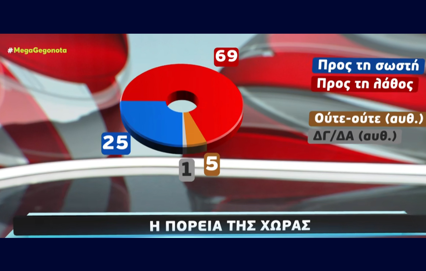 Ακόμη, το 69% πιστεύει ότι η χώρα βρίσκεται σε λάθος κατεύθυνση, σε αντίθεση με το 25% που πιστεύει ότι η χώρα κινείται σωστά.