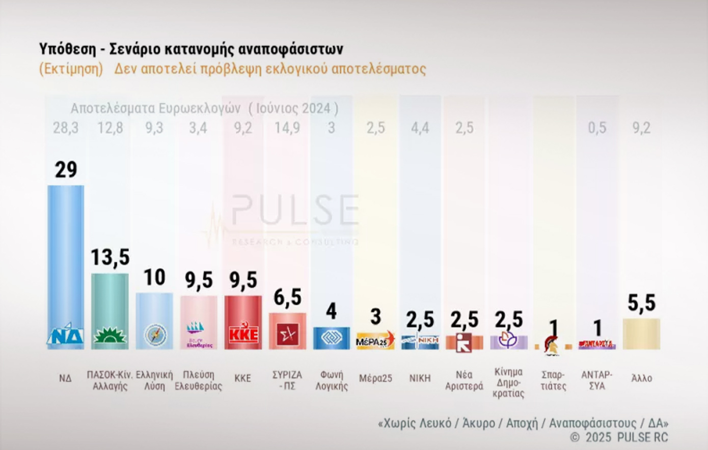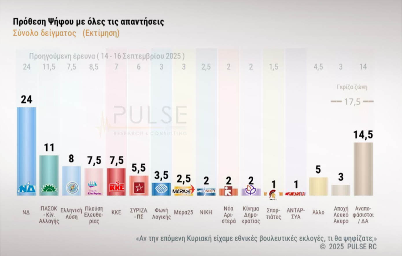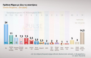 Η δημοσκόπηση της Pulse για λογαριασμό του ΣΚΑΪ έδειξε ότι η διαφορά Νέας Δημοκρατίας και ΠΑΣΟΚ είναι περίπου στις 15,5 μονάδες, ενώ αν αύριο γινόντουσαν εκλογές τότε οκτώ κόμματα θα έμπαιναν στη Βουλή.