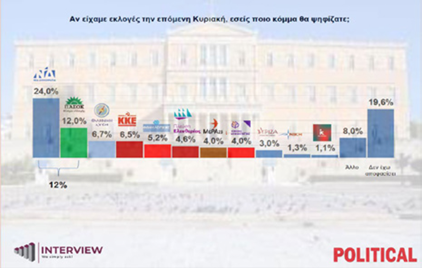 Πρώτο κόμμα και με διαφορά παραμένει η ΝΔ σε νέα δημοσκόπηση, με το ΠΑΣΟΚ να έχει μία μικρή άνοδο, σύμφωνα με την έρευνα της Interview, για την εφημερίδα Political.