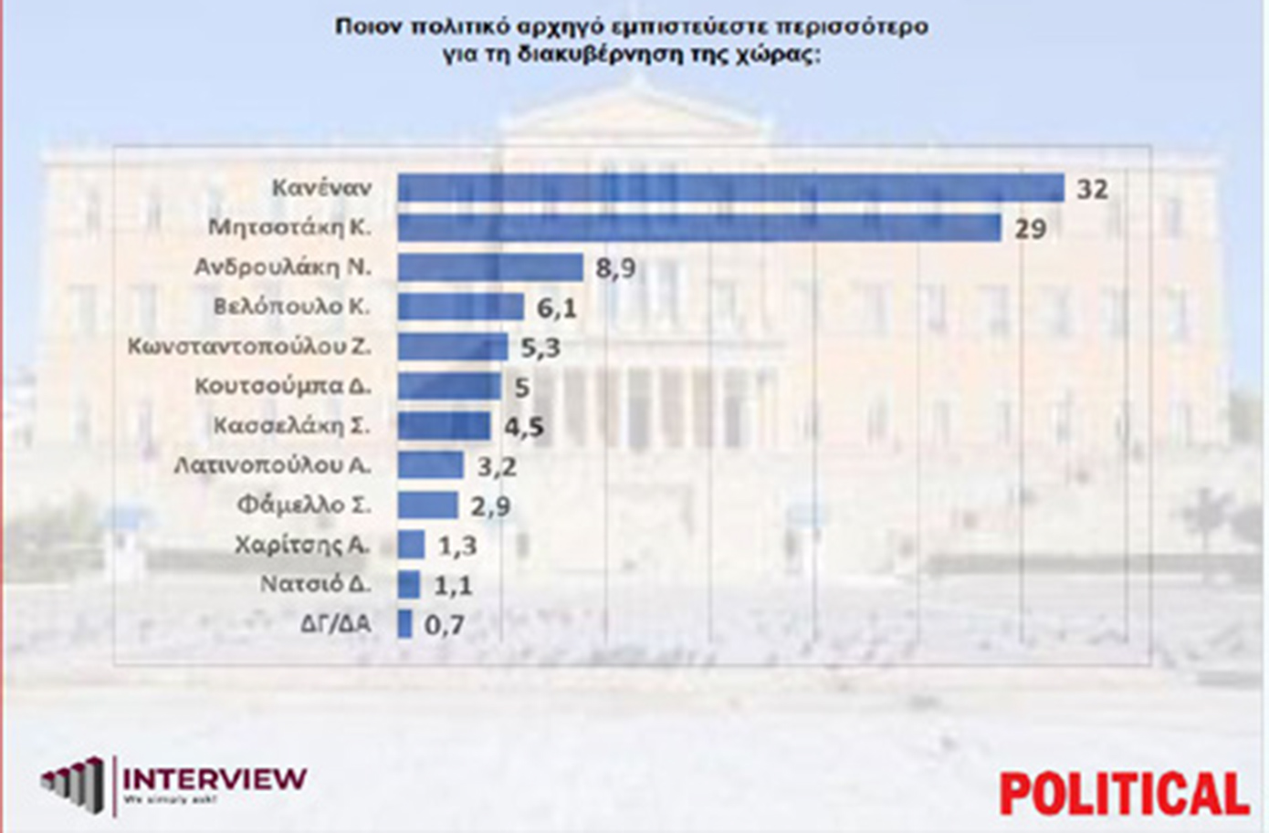 Ο Κυριάκος Μητσοτάκης στην ερώτηση ποιον πολιτικό εμπιστεύεστε πιο πολύ για τη διακυβέρνηση της χώρας συγκεντρώνει ποσοστό 29%. Στην πρώτη θέση παραμένει ο «Κανένας» με ποσοστό 32%, και ακολουθούν ο Ν. Ανδρουλάκης με 8,9%, ο Κυριάκος Βελόπουλος με 6,1%, η Ζωή Κωνσταντοπούλου με 5,3%, ο Δημήτρης Κουτσούμπας με 5%, ο Στέφανος Κασσελάκης με 4,5%, η Αφροδίτη Λατινοπούλου με 3,2%, ο Σωκράτης Φάμελλος με 2,9%.